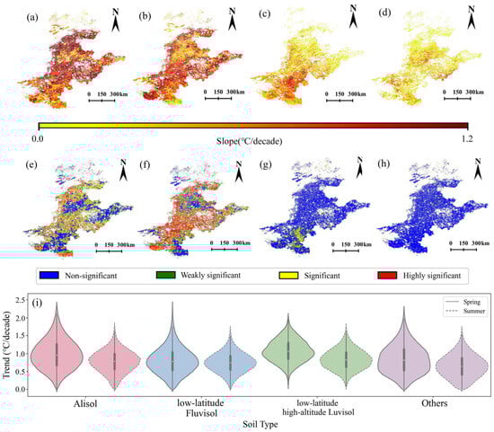 Temperature anomaly variation trends for 0–5 cm across the four seasons. The first row (a–d) shows Sen’s slope, and the second row (e–h) presents the MK test, arranged from left to right as spring, summer, autumn, and winter. (i) shows the distribution of temperature anomaly trends among four soil types for spring and summer, respectively.