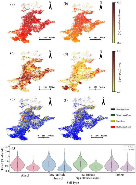 Spatial distribution of seasonality. In the first four rows, the first column represents data for 0–5 cm, and the second column represents data for 5–15 cm. (a,b) are mean temperatures. (c,d) are regions with positive Sen’s slopes. (e,f) are MK test. (g) compares four soil types for the 0–5 cm and 5–15 cm soil layers.