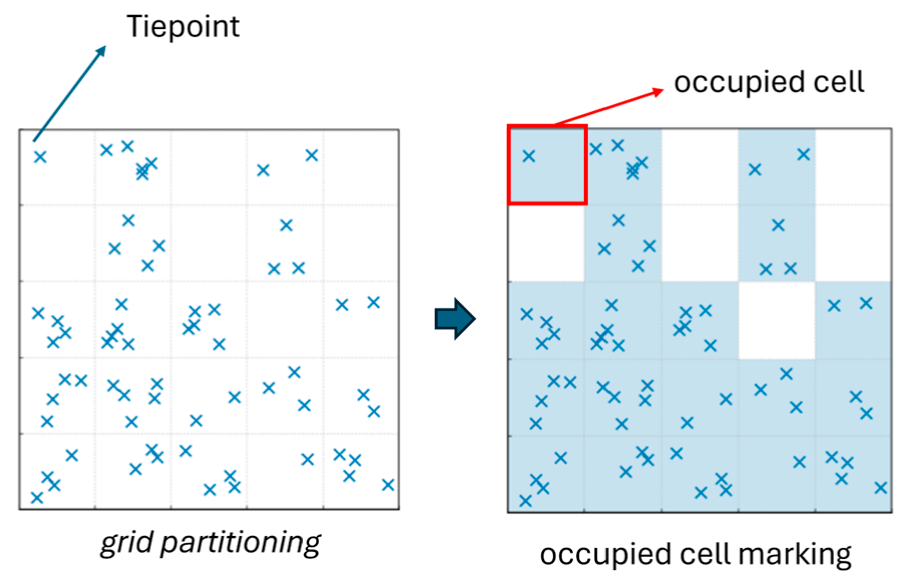 | Matching Algorithm | Number of Georeferenced Tiepoints | Coverage Ratio of Georeferenced Tiepoints | Reprojection Error (px) | Y–Parallax (px) | |