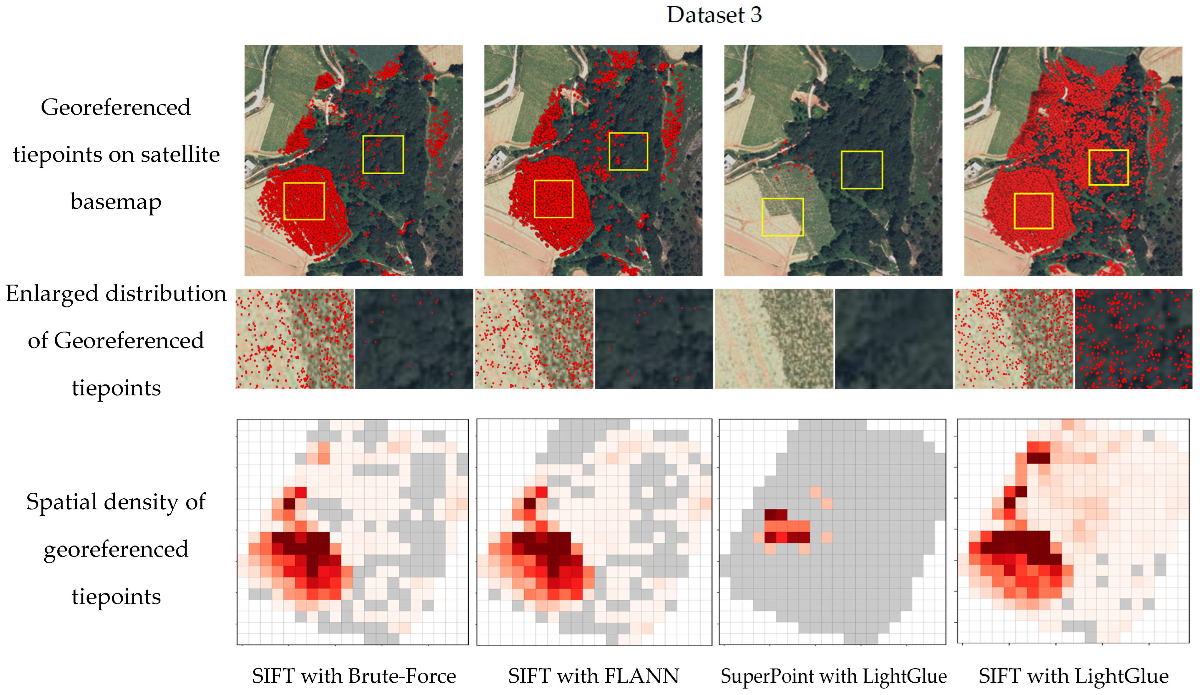 - SIFT + LightGlue outperforms traditional methods in terms of the number and spatial distribution of tiepoints/triplets in UAV images.