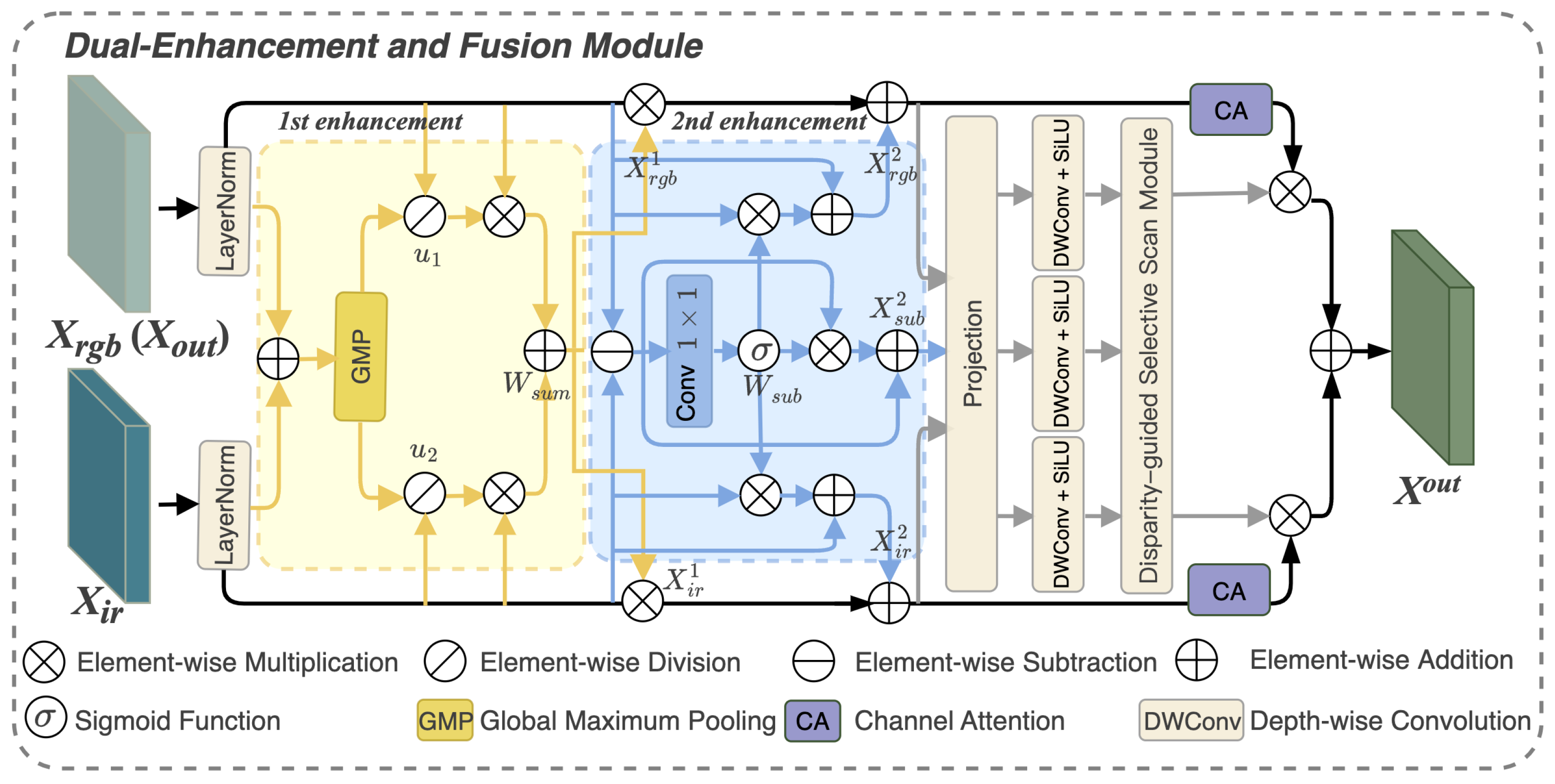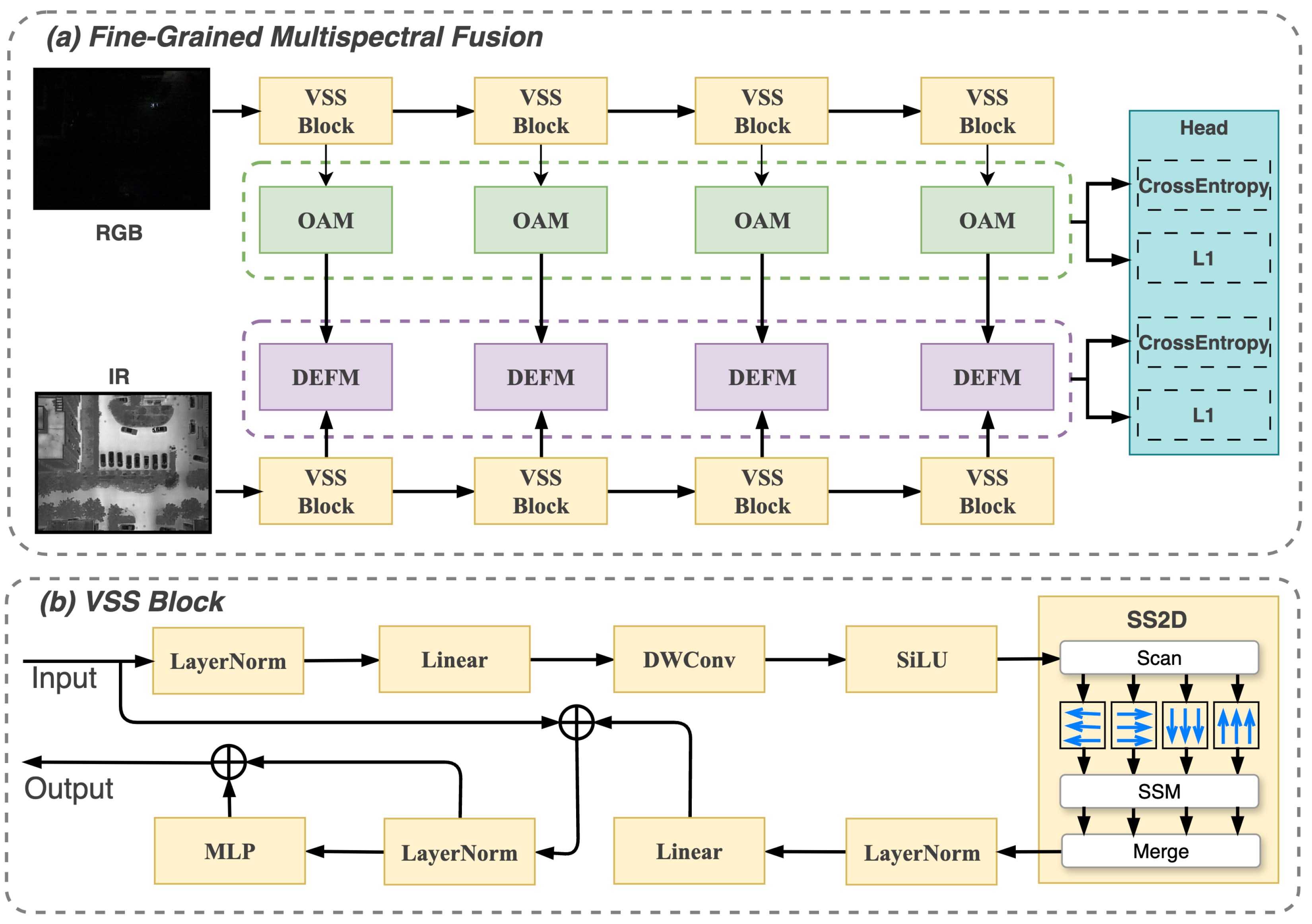- A dual-enhancement and fusion module (DEFM) is proposed for fine-grained multispectral feature calibration and fusion and an orientation aggregation module (OAM) is designed to capture directional context.