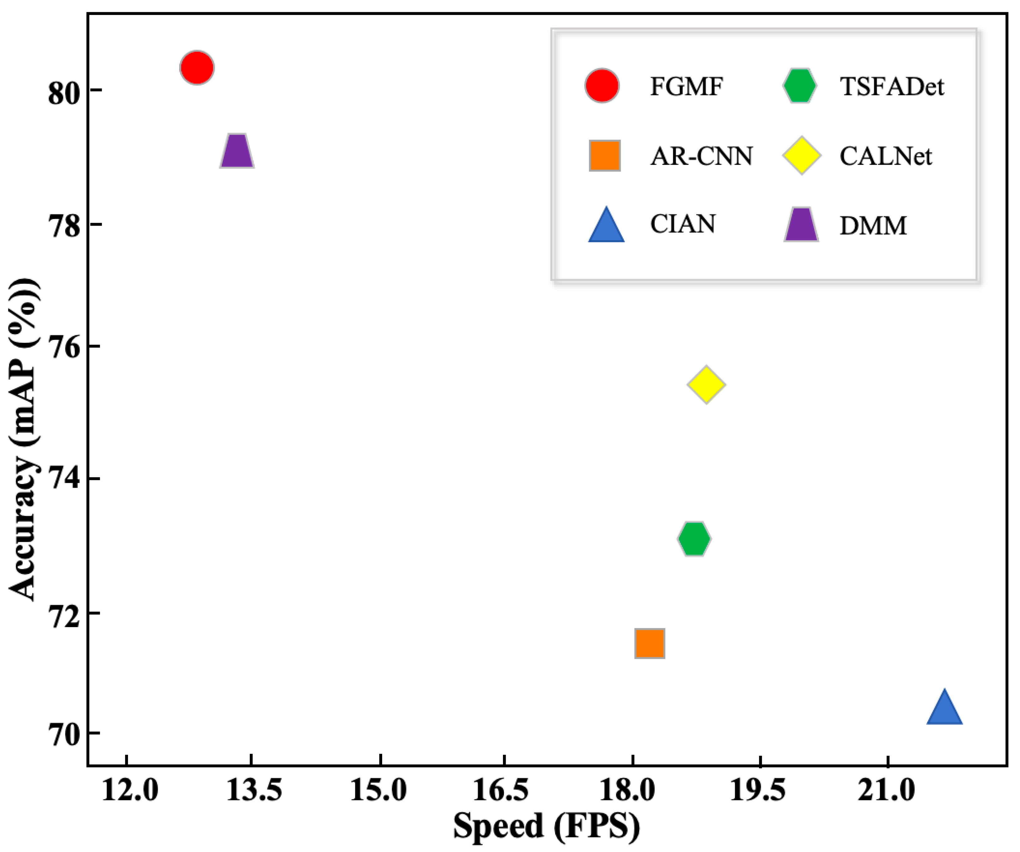 - A novel visible-infrared fusion framework for oriented object detection, FGMF, is proposed to, achieving mAP50 of 80.2% and 66.3% on the DroneVehicle and VEDAI datasets, respectively, with only 87.2M parameters.