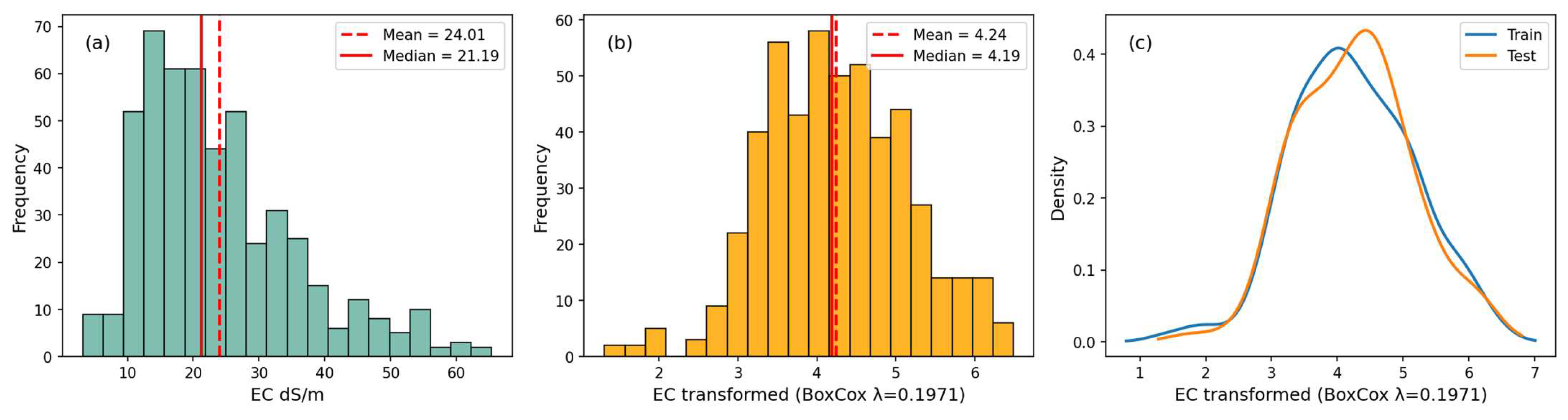 EC values derived from the EM38-MK2 measurement exhibited right-skewness (skewness ≈ 0.98), ranging from 3.21 to 65.37 dS/m and a standard deviation of 11.98 dS/m (Figure 2). This distribution reflects the presence of a small number of highly saline samples, consistent with the heterogeneous nature of salinity in the study site. Application of the Box–Cox transformation (λ = 0.1971) effectively normalized the response variable, reducing skewness to 0.03 and standard deviation to 0.93, and producing a near-symmetric distribution spanning 1.31 to 6.49 (Table 3). This transformation improved the suitability of the dataset for statistical modelling by stabilizing variance and aligning the training and validation subsets, as confirmed by the overlapping kernel density estimates (KDEs) (Figure 2).
