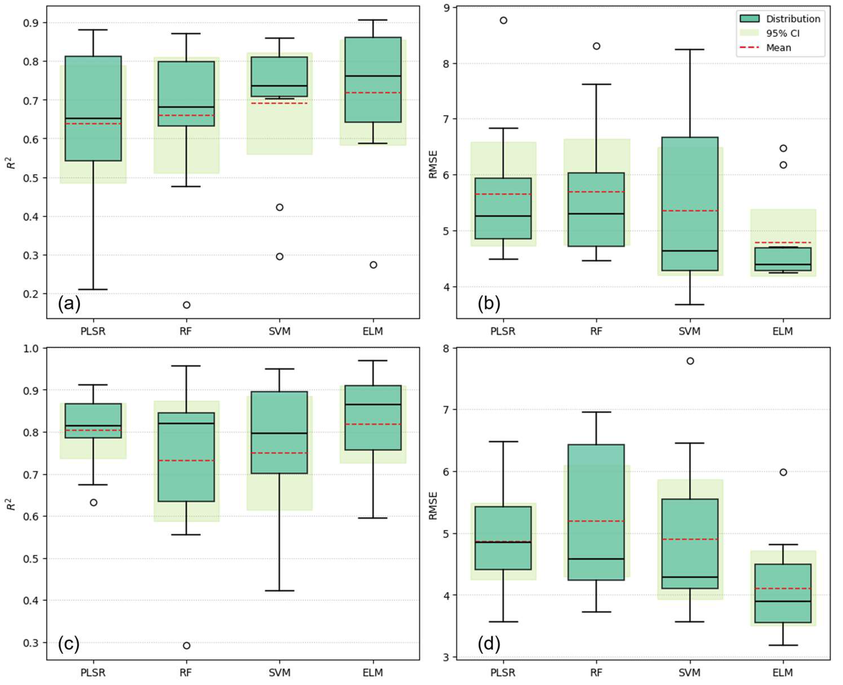Figure 3 shows that the stacking ensemble (ELM) attains the highest central R 2   and the lowest RMSE for both sensors, with the narrowest 95% confidence intervals, indicating superior accuracy and stability under spatial blocking. RF and PLSR form an intermediate tier: RF reaches moderate R 2 but with wider dispersion, while PLSR has competitive medians and slightly tighter variability with PlanetScope than with UAV. SVR displays the largest spread and several low- R 2 or high-RMSE outliers, reflecting sensitivity to the spatial fold configuration. A clear sensor effect is visible, as for the same algorithm PlanetScope distributions are shifted toward higher R 2 and lower RMSE compared with UAV, and the confidence bands are generally tighter, particularly for ELM and PLSR.