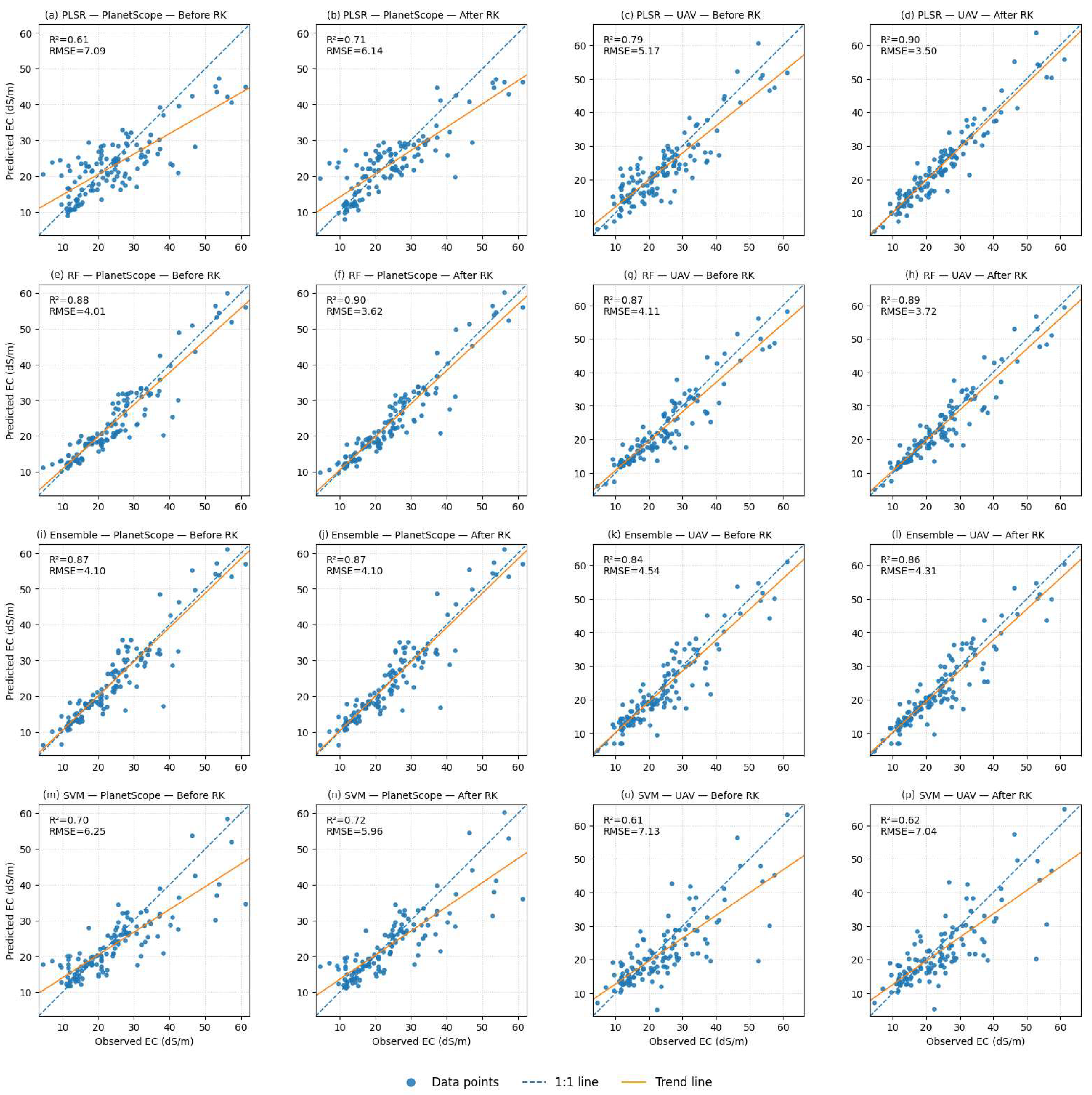 Figure 4 shows scatterplots of observed versus predicted soil salinity (EC) across PlanetScope- and UAV-based models, before and after regression kriging (RK). For PLSR (panels a–d), predictions before RK are more dispersed, with underestimation of high EC values and wider scatter around the 1:1 line. After RK, the point clouds tighten considerably, aligning more closely with the 1:1 line and reducing extreme deviations. RF models (panels e–h) exhibit compact clusters even before RK, with points concentrated along the 1:1 line and only minor residual scatter; RK further smooths alignment but does not drastically alter the overall fit. ELM results (panels i–l) display consistent mid-level clustering, with RK mainly reducing scatter around the extremes rather than shifting the central trend. SVR models (panels m–p) present the widest spreads: points are scattered well above and below the 1:1 line, with systematic underprediction at higher observed salinity. RK modestly reduces noise, producing a slightly tighter cloud, but many points still deviate substantially. Taken together, the plots emphasize that RF provides the most stable and concentrated fit, ELMs and PLSR show moderate-to-strong clustering (with PLSR benefiting most from RK), and SVR retains the weakest, most diffuse patterns even after RK.