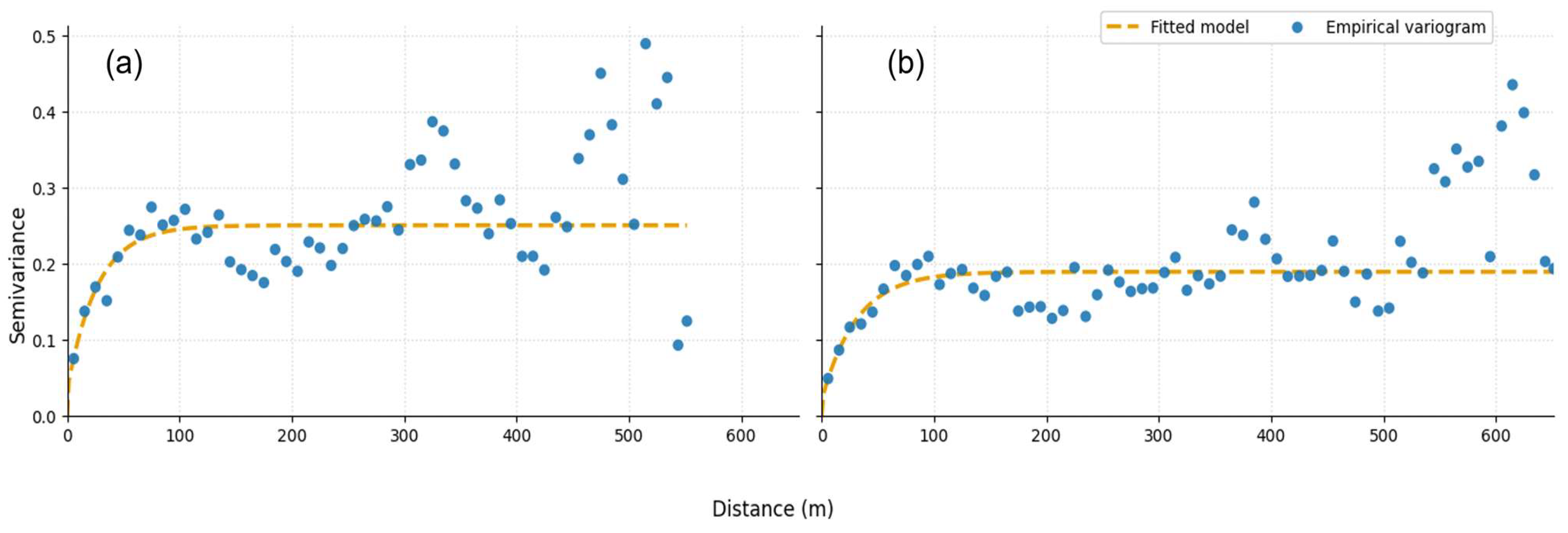 Figure 5. Variograms of PLSR residuals with fitted models. Panels show semivariance as a function of lag distance for (a) UAV-based predictors and (b) PlanetScope-based predictors. Blue points denote the empirical semivariances, and the orange dashed curve is the weighted least-squares fitted variogram.