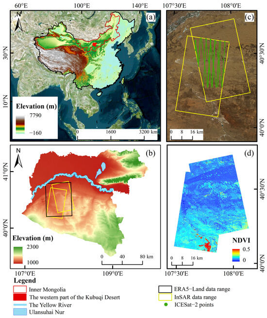 Overview of the study area and data coverage. (a,b) Location of the study area, and ERA5-Land meteorological data (black rectangle). (c) Coverage of TanDEM-X InSAR data (yellow rectangle) and distribution of ICESat-2 validation points (green dots). (d) Mean NDVI of the study area from 2013 to 2018.