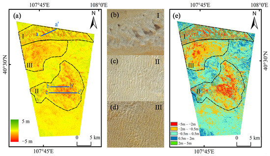 Three sand dune regions (called as Region I, II and III, as shown in Figure 5a) were selected by for detailed analysis based on their distinct sand dune morphologies and spatial distribution patterns (see Figure 5b–d).