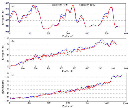Further, to quantitatively analyze the topographic evolution, three profiles (i.e., aa′, bb′, cc′) were established perpendicular to the sand dune ridge orientations, as shown in Figure 6. Profile aa′ (see Figure 6a) traverses dunes with heights of 20 to 40 m, spaced over 100 m apart. The elevation difference in two DEMs along the profile aa′ varies from around −12.0 m to 3.7 m within the dune areas, while the inter-dune corridors show minor changes. These suggest the height of the sand dunes decreased since 26 December 2012.