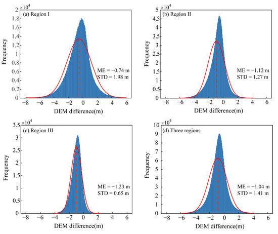 The Gaussian frequency distribution histogram of DEM differences in the dune deformation region. (a–c) Statistical results for Regions I, II, and III; (d) combined histogram for the three regions.