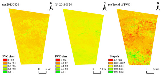 Spatial distribution of the fractional vegetation cover (FVC) in the study area derived from Landsat 8 imagery on (a) 26 August 2013 and (b) 24 August 2018. (c) The corresponding interannual trend of FVC from 2013 to 2018.