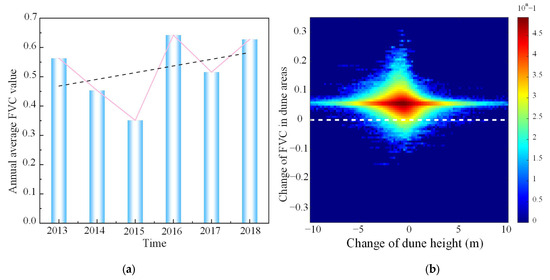 (a) Interannual variation in the average FVC from 2013 to 2018; (b) analysis of the correlation between the change in dune height and the change in FVC.
