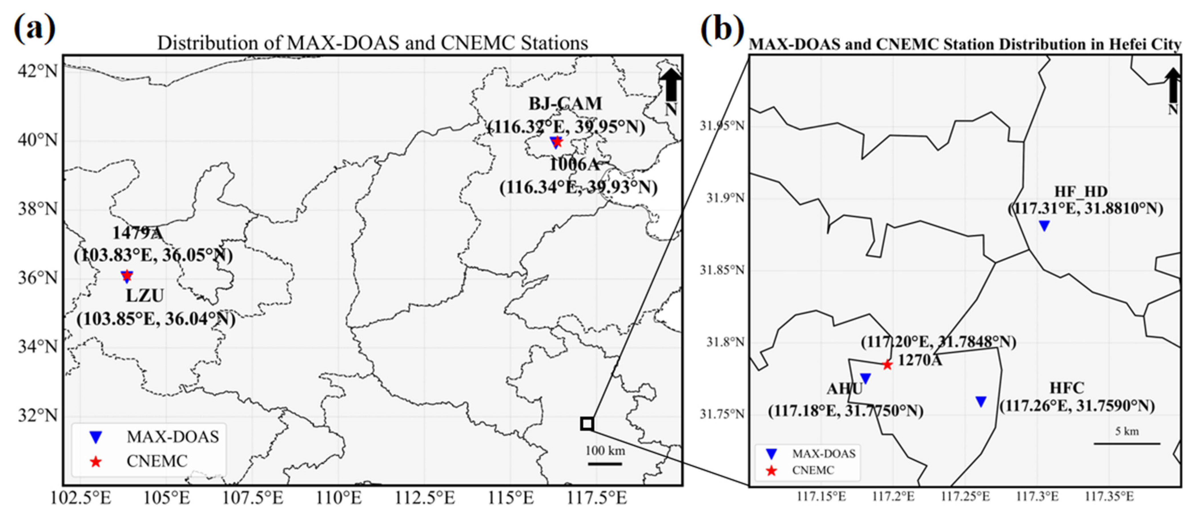 | MAX-DOAS Site Name | Latitude and Longitude | Observation Time | Elevation Angle Sequence | Observation Azimuth Direction |