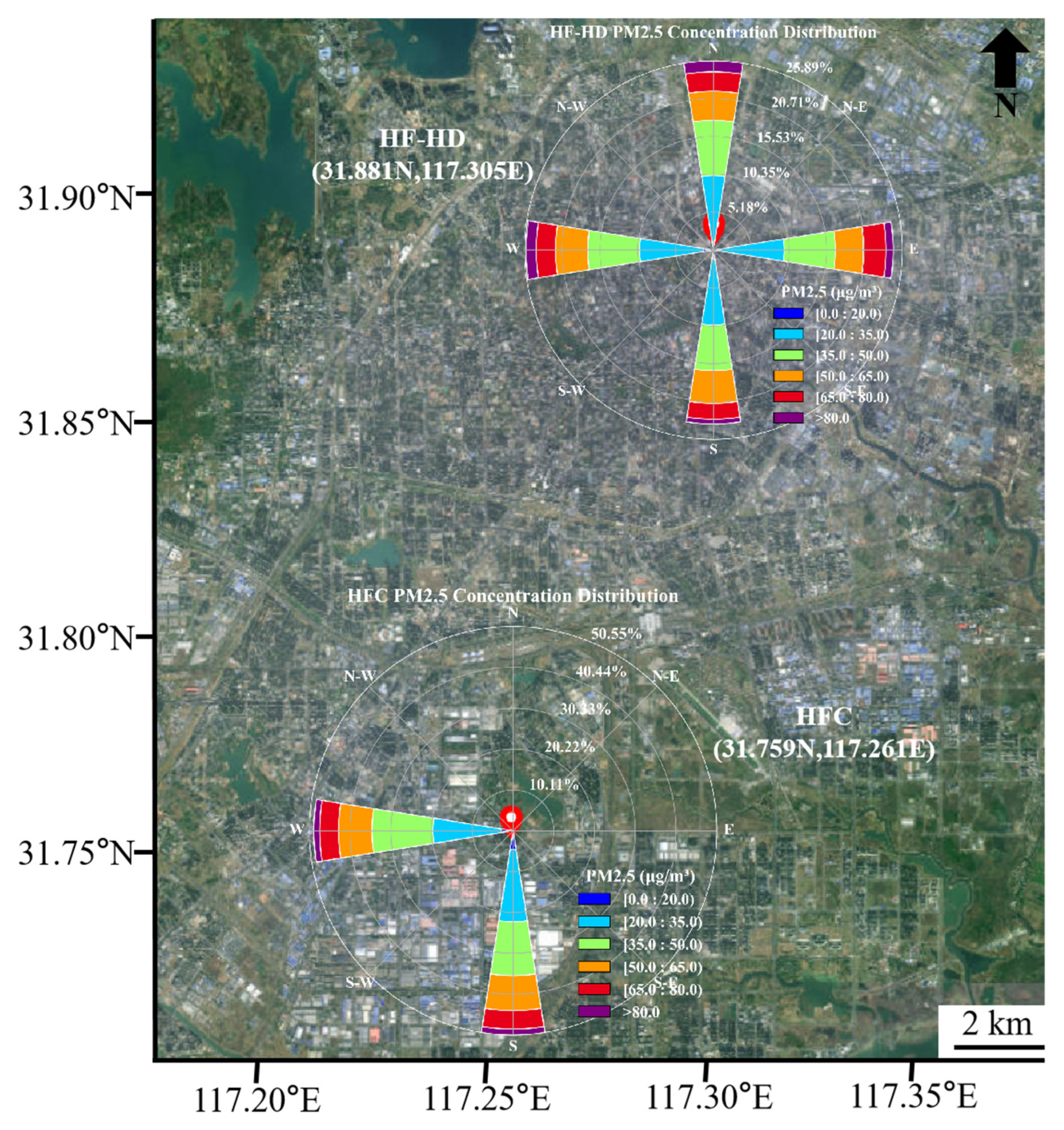 3.6. Spatial Distribution of PM2.5 in Hefei