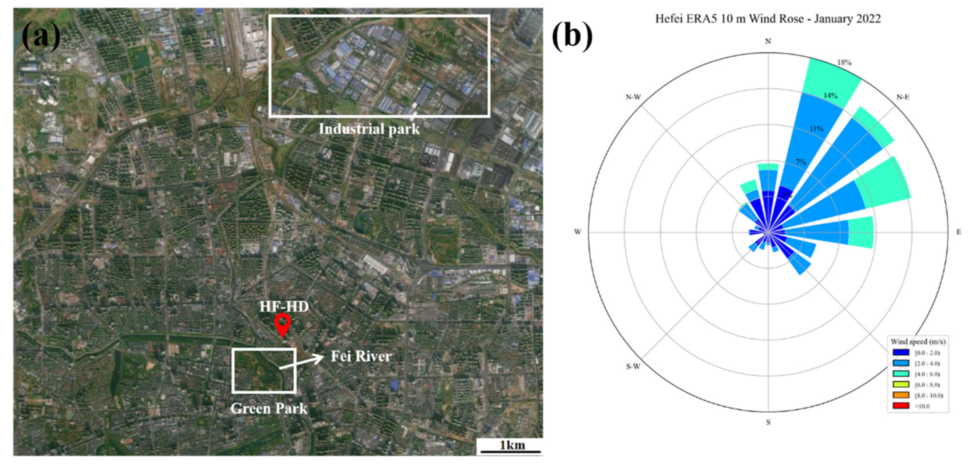 3.7. Transport of PM2.5 During a Pollution Episode in Hefei