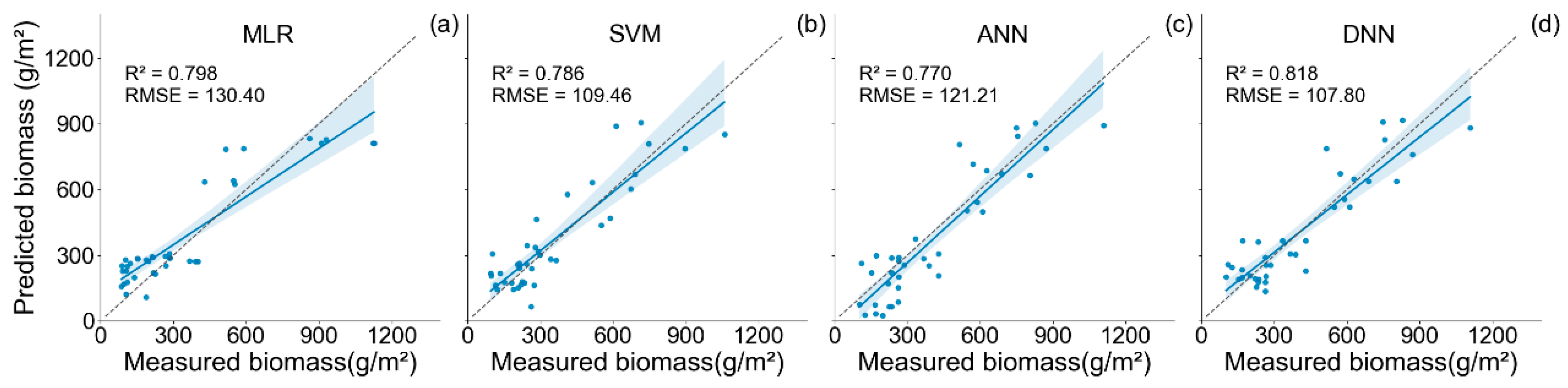 - Morais, T.G.; Teixeira, R.F.M.; Figueiredo, M.; Domingos, T. The use of machine learning methods to estimate aboveground biomass of grasslands: A review. Ecol. Indic. 2021, 130, 108081. [Google Scholar] [CrossRef]