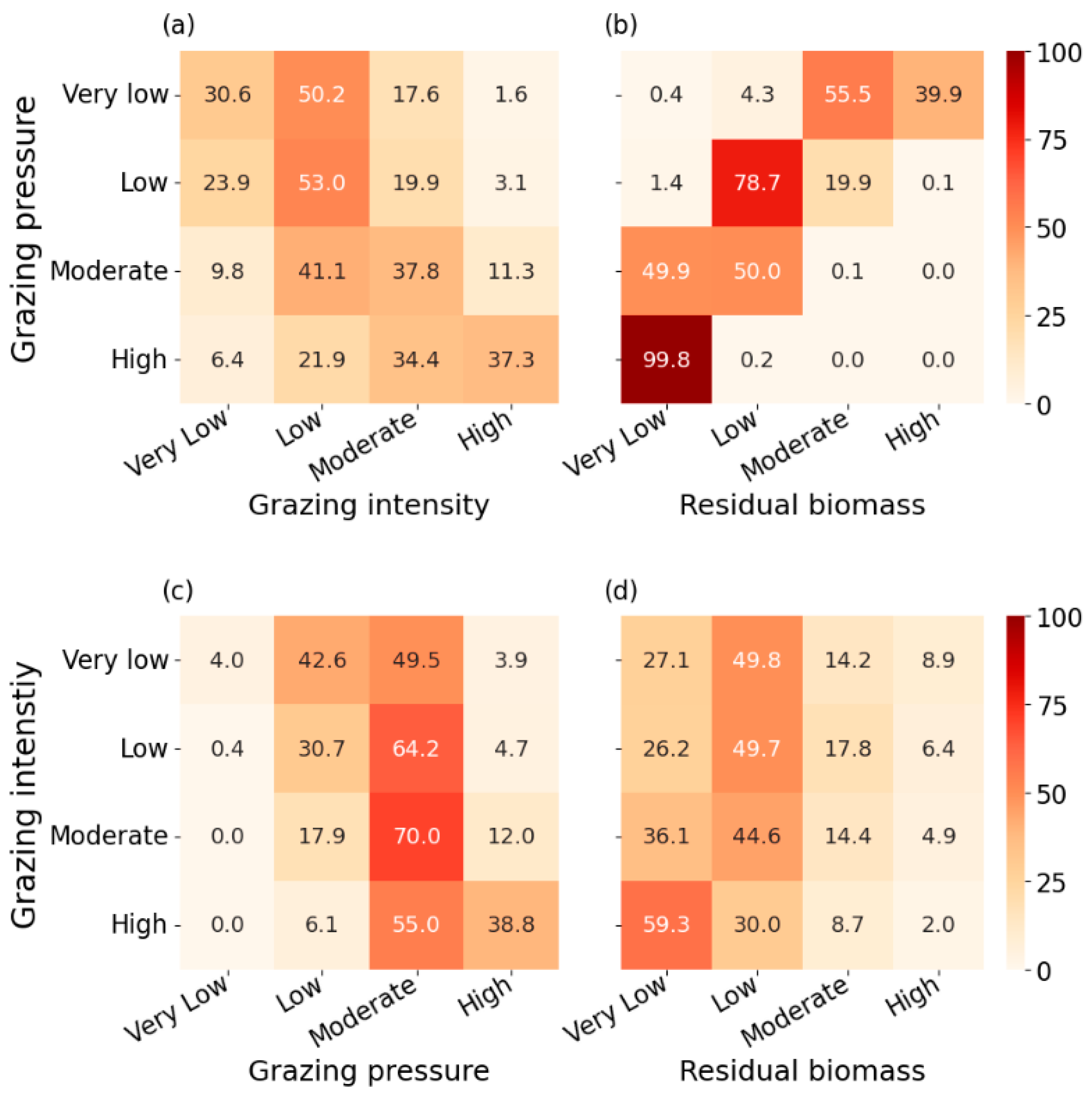 - Grazing intensity alone poorly explains grazing pressure and pasture degradation risk, but uncertainty is reduced when estimates are integrated with residual biomass.