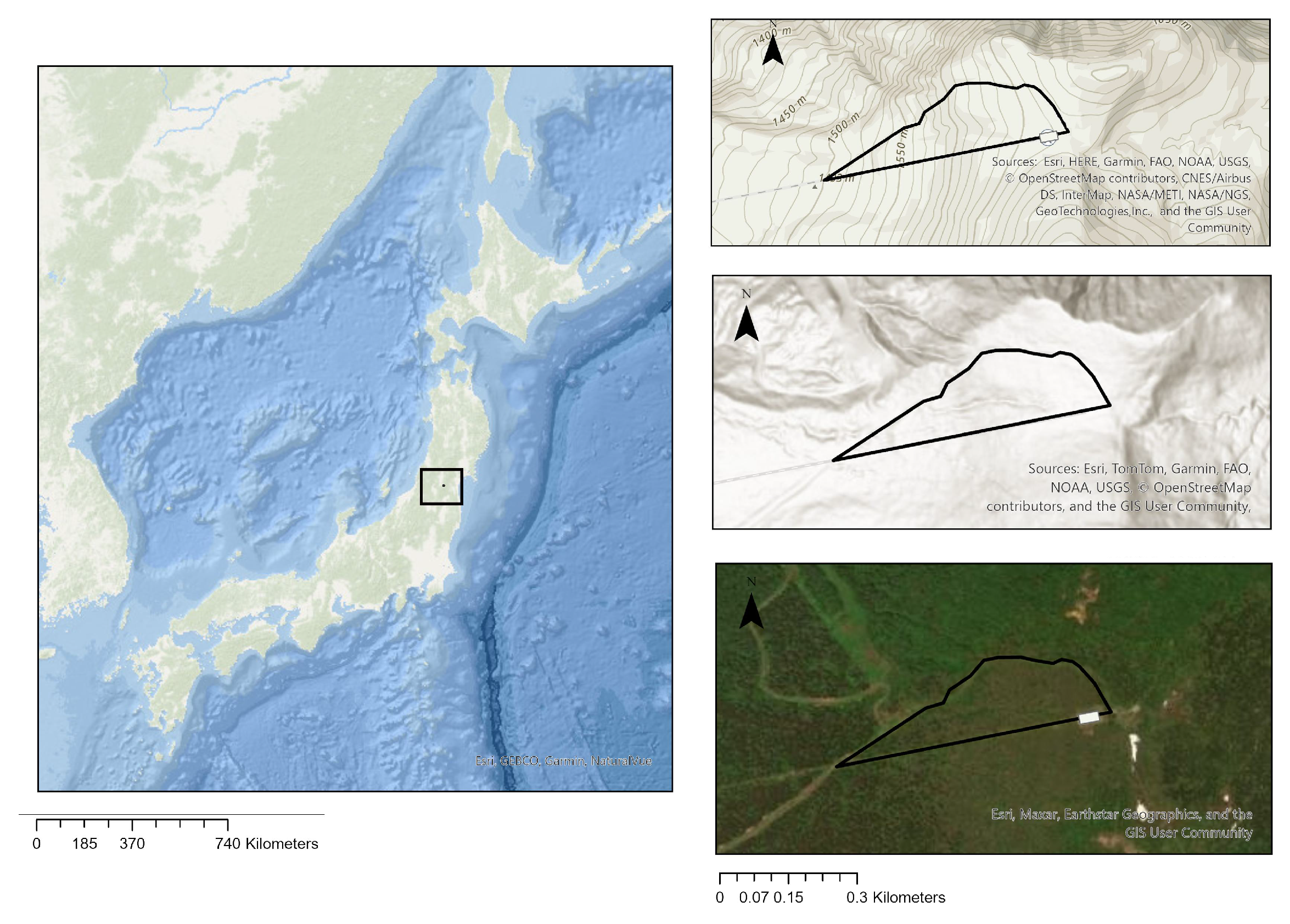 - Tohoku Forest Management Bureau (MAFF). Status and Response to Abies mariesii Dieback in the Zao Region (Yamagata Prefecture Side); Official Report. Ministry of Agriculture, Forestry and Fisheries: Japan, 2024. Available online: https://yamagatayama.com/jyuhyo/wp-content/uploads/2024/01/%E8%94%B5%E7%8E%8B%E5%9C%B0%E5%9F%9F%EF%BC%88%E5%B1%B1%E5%BD%A2%E7%9C%8C%E5%81%B4%EF%BC%89%E3%81%AB%E3%81%8A%E3%81%91%E3%82%8B%E3%82%AA%E3%82%AA%E3%82%B7%E3%83%A9%E3%83%93%E3%82%BD%E3%81%AE%E6%9E%AF%E6%90%8D%E5%AE%9F%E6%85%8B%E3%81%A8%E5%AF%BE%E5%BF%9C%E7%8A%B6%E6%B3%81%EF%BC%88%E6%9D%B1%E5%8C%97%E6%A3%AE%E6%9E%97%E7%AE%A1%E7%90%86%E5%B1%80%EF%BC%89.pdf (accessed on 9 October 2025).