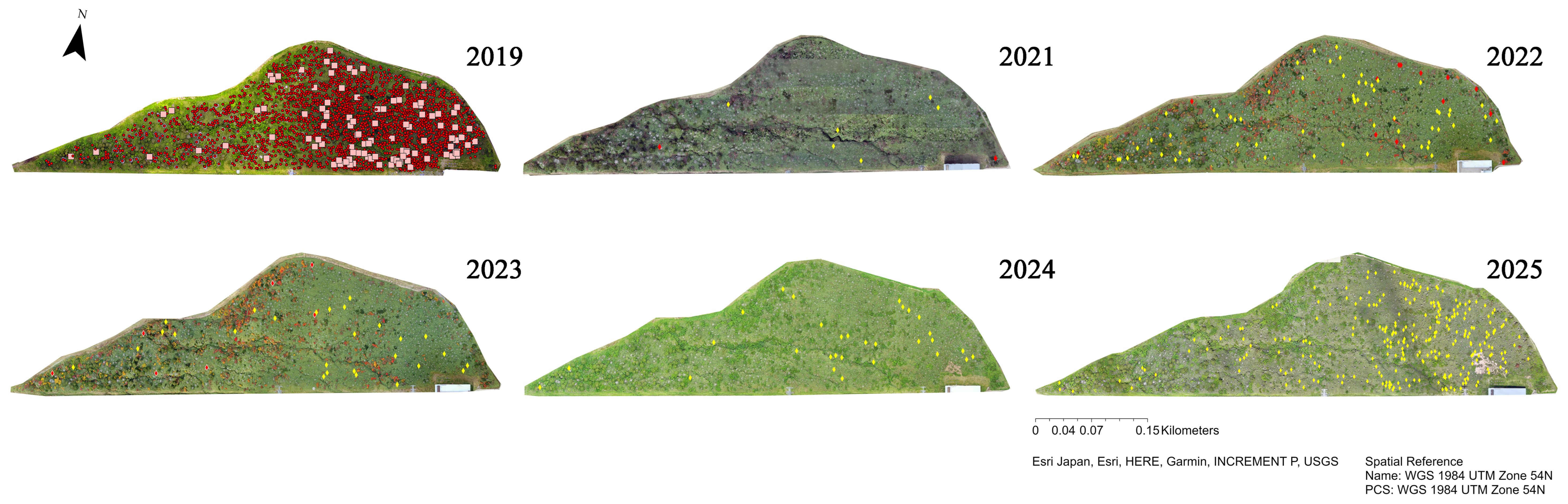 - UAV imagery was employed to monitor the increase of young trees from 60 in 2019 to 119 in 2025.