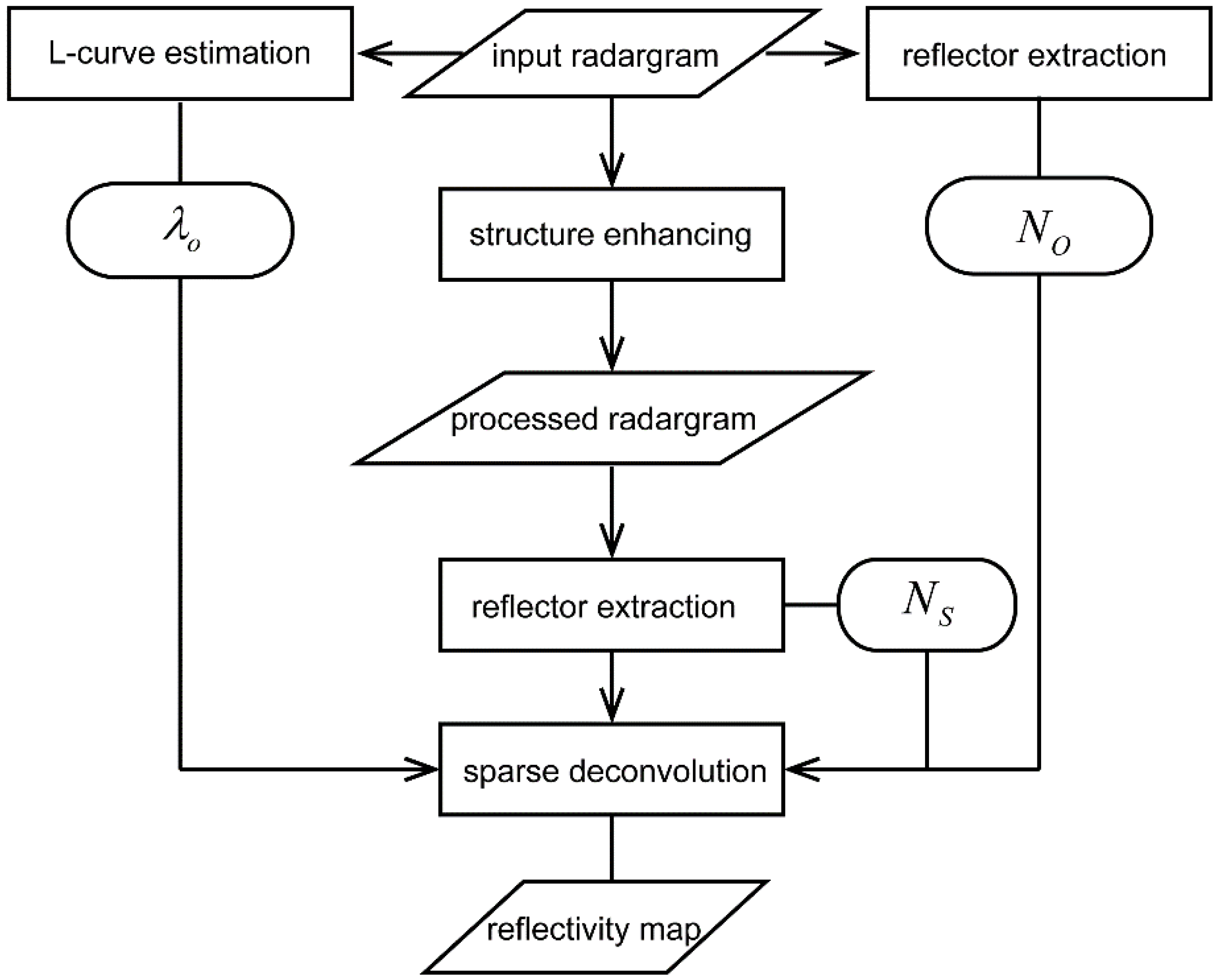 The first term is the data fidelity or data misfit term. The second term is the regularization term. The l1-norm r 1 = i r i is a convex function that promotes sparsity in the solution vector r. The positive regularization parameter λ controls the trade-off between data fidelity and the sparsity of the solution. A small value of λ will result in a solution that fits the data very closely but may be less sparse and contain noise. A large value of λ will enforce strong sparsity, producing a result with very few, sharp reflectors, but may risk suppressing genuine, weaker geological features or deviating significantly from the observed data. The optimal value of λ is typically determined empirically, for example, using the L-curve method, which plots data misfit against solution sparsity [17]. However, noise present in the original radargram often biases the L-curve toward a smaller λ o , which is suboptimal for recovering weak reflectivity. To address this issue, we compare the number of reflectors in both the original and structure-enhanced radargrams ( N O and N S , respectively). The ratio of these two quantities is then used to adjust the small λ value obtained from the L-curve, thereby improving the deconvolution performance when using the structure-enhanced radargrams as input: