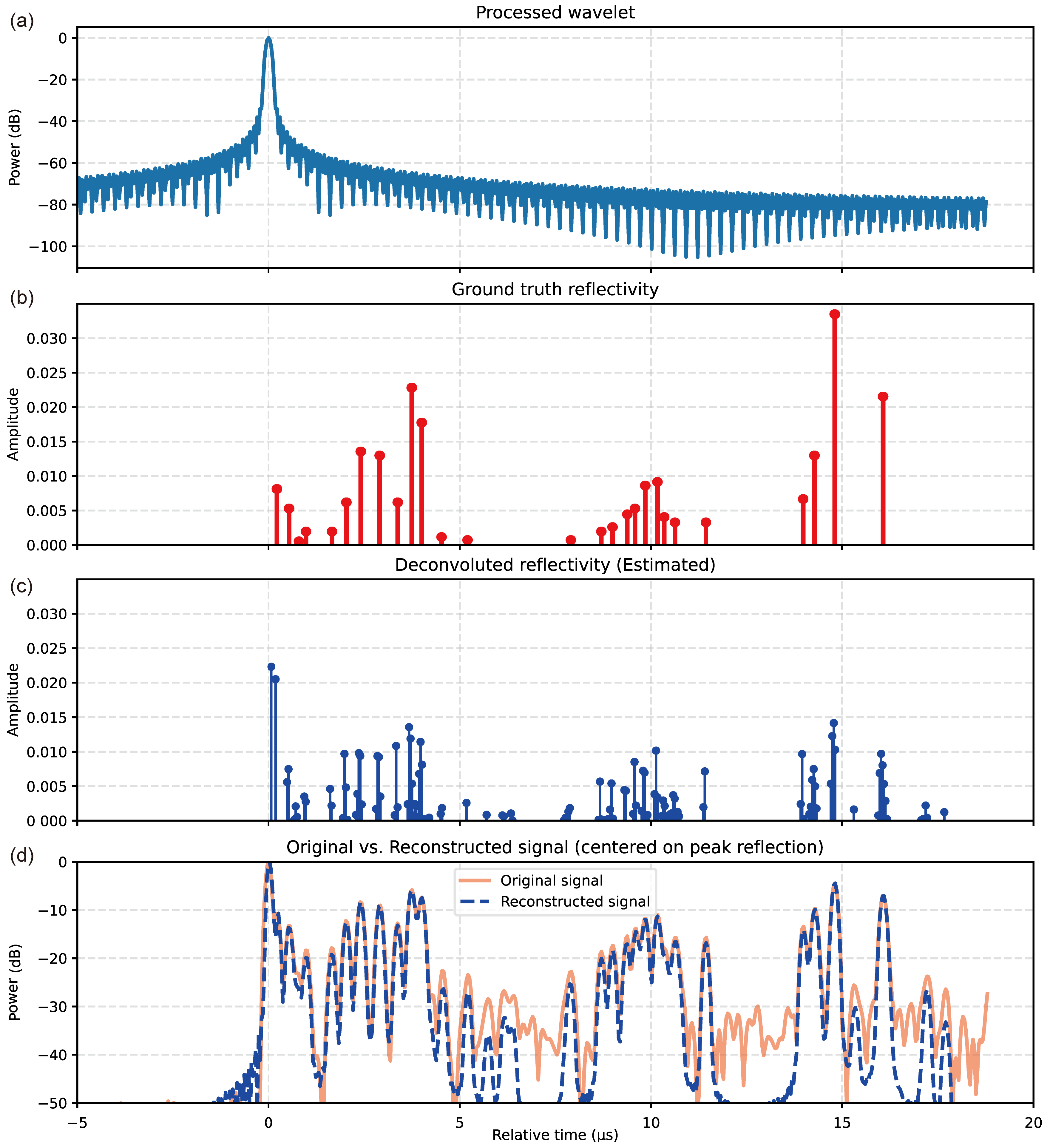 We observed that in columns where the surface is steep and the reflector echo power is low, the deconvolution often yields non-sparse, spurious reflectivity (Figure 8). This behavior arises because steep dips violate the 1D convolutional assumption, as the recorded trace represents a mixture of signals from rapidly varying reflector geometries. Consequently, the single-wavelet, single-reflectivity-per-sample model provides only an approximation. Additionally, when reflector echo power is close to the noise floor, the inverse problem becomes ill-conditioned and regularized solvers (especially those tuned to promote sparsity) can overfit noise or create oscillatory solutions [29,30]. To reduce these artifacts, we could improve the local wavelet estimation, for instance, by extracting the wavelet directly from the local surface reflector [33]. This locally adaptive wavelet better represents the true system response under varying geometric and scattering conditions, compensating for phase distortions and amplitude loss that occur over steep surfaces. Consequently, the deconvolution becomes more stable and yields reflectivity sections that are spatially coherent and free of artificial, non-sparse patterns, as shown in Figure 10.