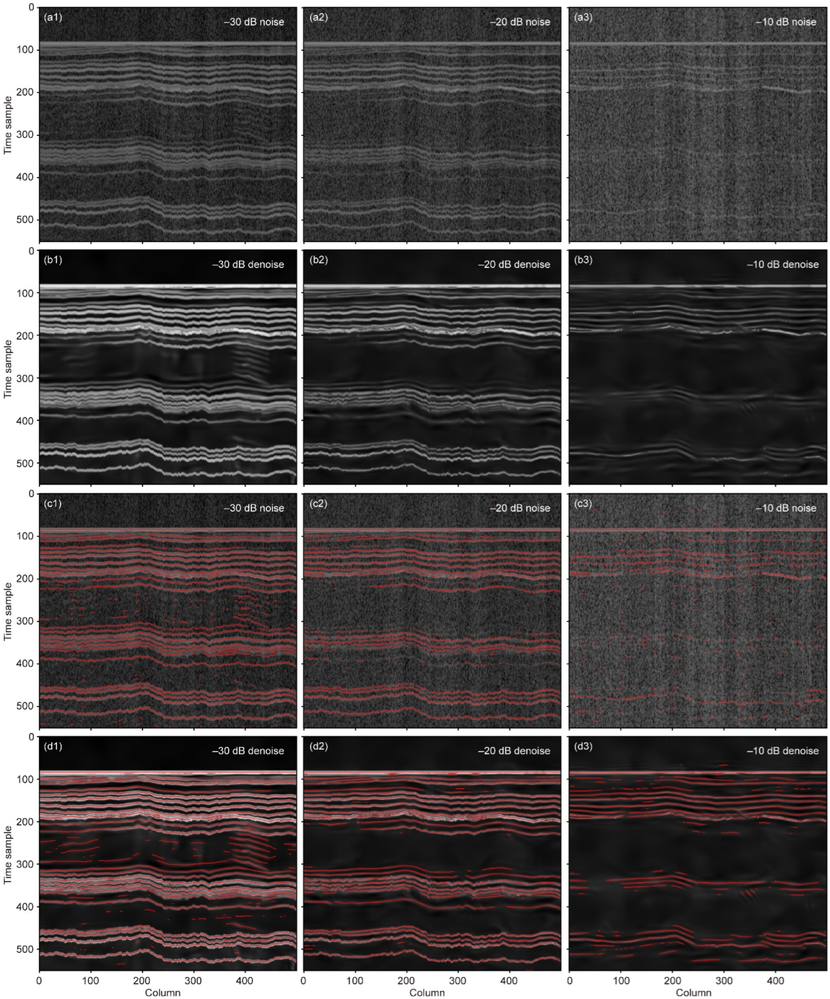 Figure 3. (a1a3) Synthetic radargrams with low, moderate, and high noise levels (b1b3) Structure-enhanced radargrams for those in (a1a3). (c1c3) Extracted reflectors (shown in red) of synthetic radargrams shown in (a1a3). (d1d3) Extracted reflectors (shown in red) of structure-enhanced radargrams shown in (b1b3). With the increasing noise level, the number of extracted reflectors decreases; therefore, a higher λ value is needed to mitigate artifacts in the deconvolution results. Note the high SNR and more extracted reflectors for structure-enhanced radargrams. The ratio of the number of extracted reflectors in the original noisy radargrams to that in the structure-enhanced radargrams is approximately 0.8 for all noise level cases.