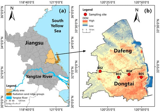 Overview of the eastern coastal area of Jiangsu Province. (a) Geographical location of the study area; (b) distribution of sampling sites (B02–B05).
