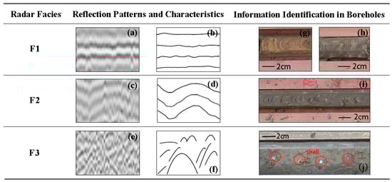Correspondence between radar reflection patterns and borehole structure. (a,c,e) display selected radar facies from the GPR profile, with (b,d,f) showing the corresponding interpreted GPR line-drawings, respectively. The correlative soil information from boreholes is presented in (g–j).