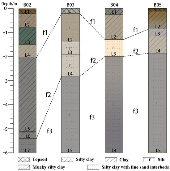 F1—Continuous horizontal or sub-horizontal reflections (Figure 4a,b). This configuration is typically associated with still-water or low-energy depositional settings, where sedimentation occurs gradually, forming vertically persistent layers. It reflects the development of horizontal bedding and is widely identified across all surveyed profiles, mainly occurring between depths of 0 and 0.8 m (Figure 5). The facies displays high-amplitude, continuous, parallel reflections and corresponds to horizontally banded structures in borehole logs, with layer thicknesses ranging from 0.2 to 0.5 cm. Sediments are primarily composed of clay and silty clay, exhibiting colors from yellowish-gray to brown. Occasional local sub-parallel reflections suggest minor dip variations, possibly linked to intermittent changes in sediment input.
