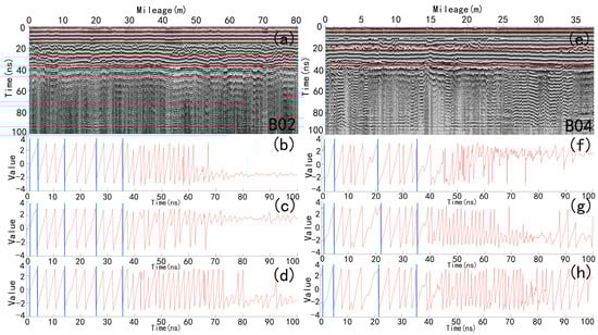 Sedimentary thickness delineation results based on radar image waveform. (a) Radar time profile at site B02; (b–d) transect positions at 20 m, 40 m, and 60 m of B02 survey line; (e) radar time profile at site B04; (f–h) transect positions at 9.5 m, 19 m, and 28.5 m of B04 survey line. Red lines in (a,e) denote identified time-domain interfaces of soil layers; blue lines in (b–d,f–h) indicate layer boundaries at specified transects.
