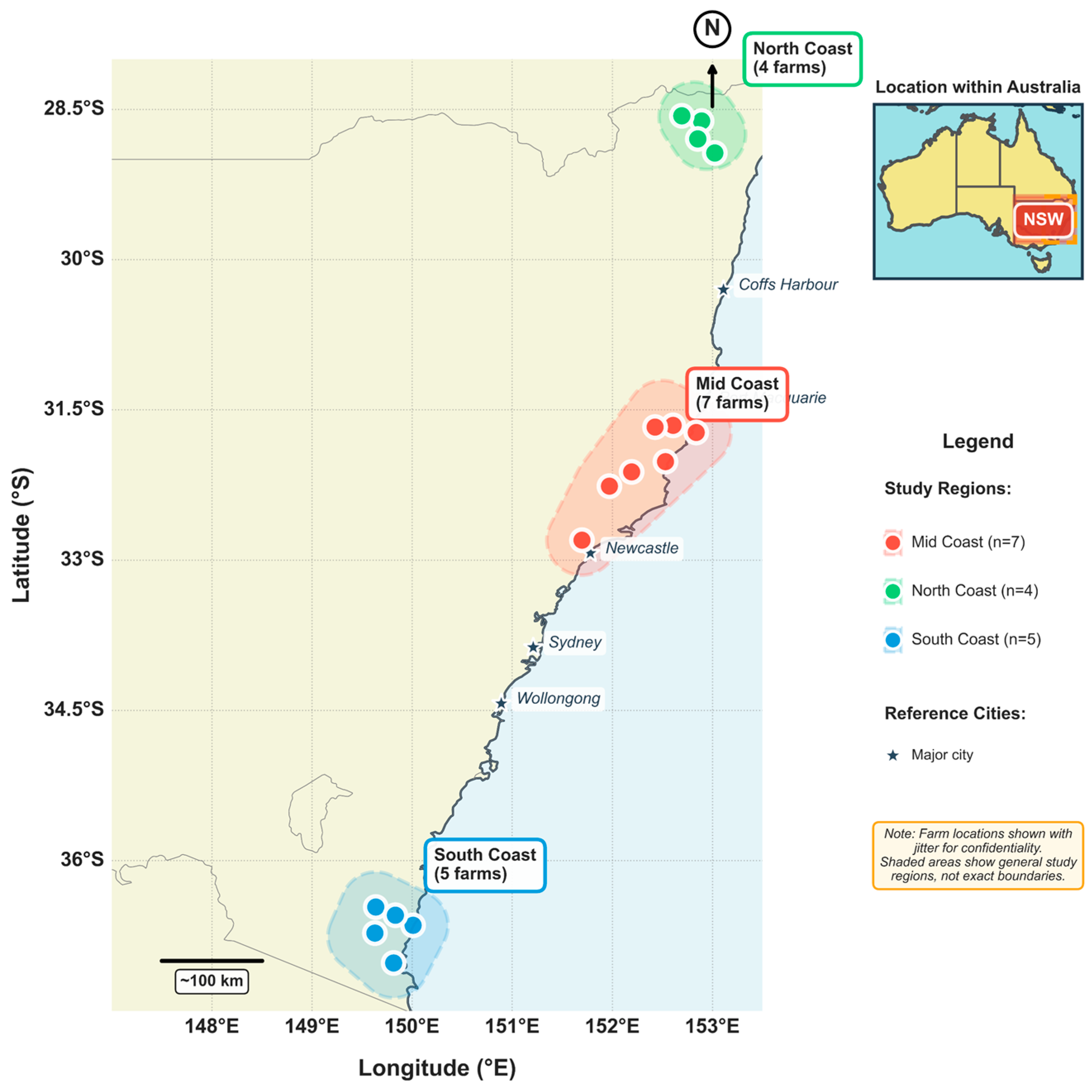 Figure 1). The farms were distributed across the mid-coast district (n = 7 farms, latitude range: −34.03° to −31.72°S, longitude range: 150.65° to 152.68°E), the south coast (n = 5 farms, latitude range: −36.82° to −36.64°S, longitude range: 149.60° to 149.90°E), and the north coast (n = 4 farms, latitude range: −28.90° to −28.68°S, longitude range: 152.91° to 153.13°E), with specific farm coordinates withheld to maintain commercial confidentiality. These farms collectively managed 2436 hectares of grazing land, with herd sizes varying from 105 to 580 milking cows, and individual farms containing between 22 and 83 paddocks, with utilisable grazing areas ranging from 64.5 ha to 313 ha. The study regions presented diverse weather conditions, with long-term mean annual rainfall averaging approximately 780 mm in the south coast, 1284 mm in the mid-coast, and 1073 mm in the north coast. Average daily air temperatures ranged from approximately 5 to 20 °C in winter and 20 to 35 °C in summer. All farms had pastures based on kikuyu (