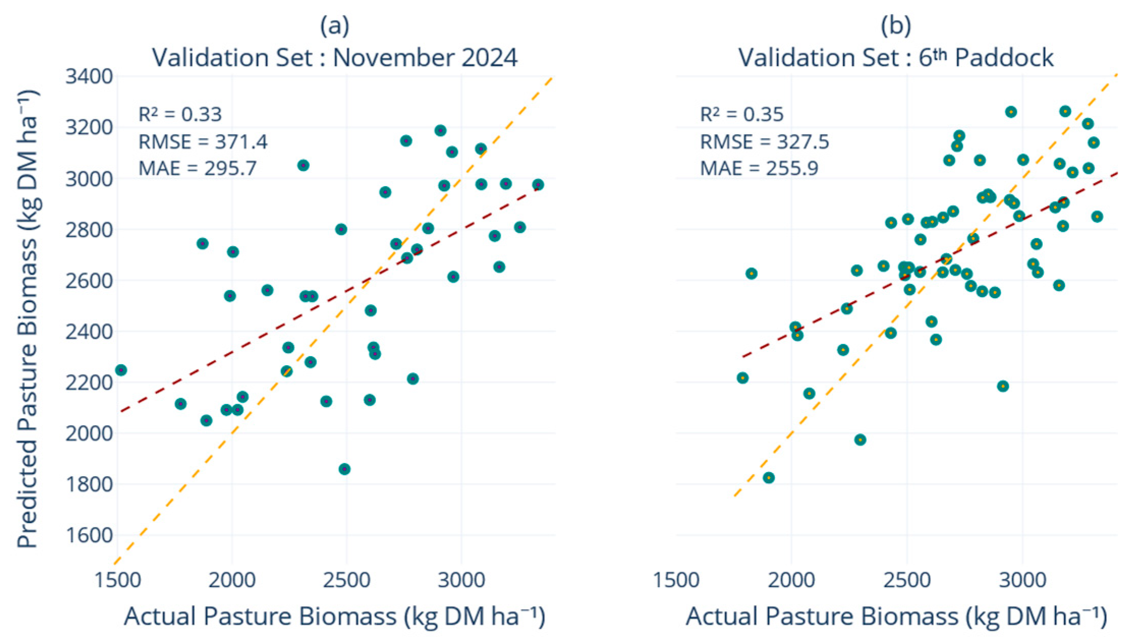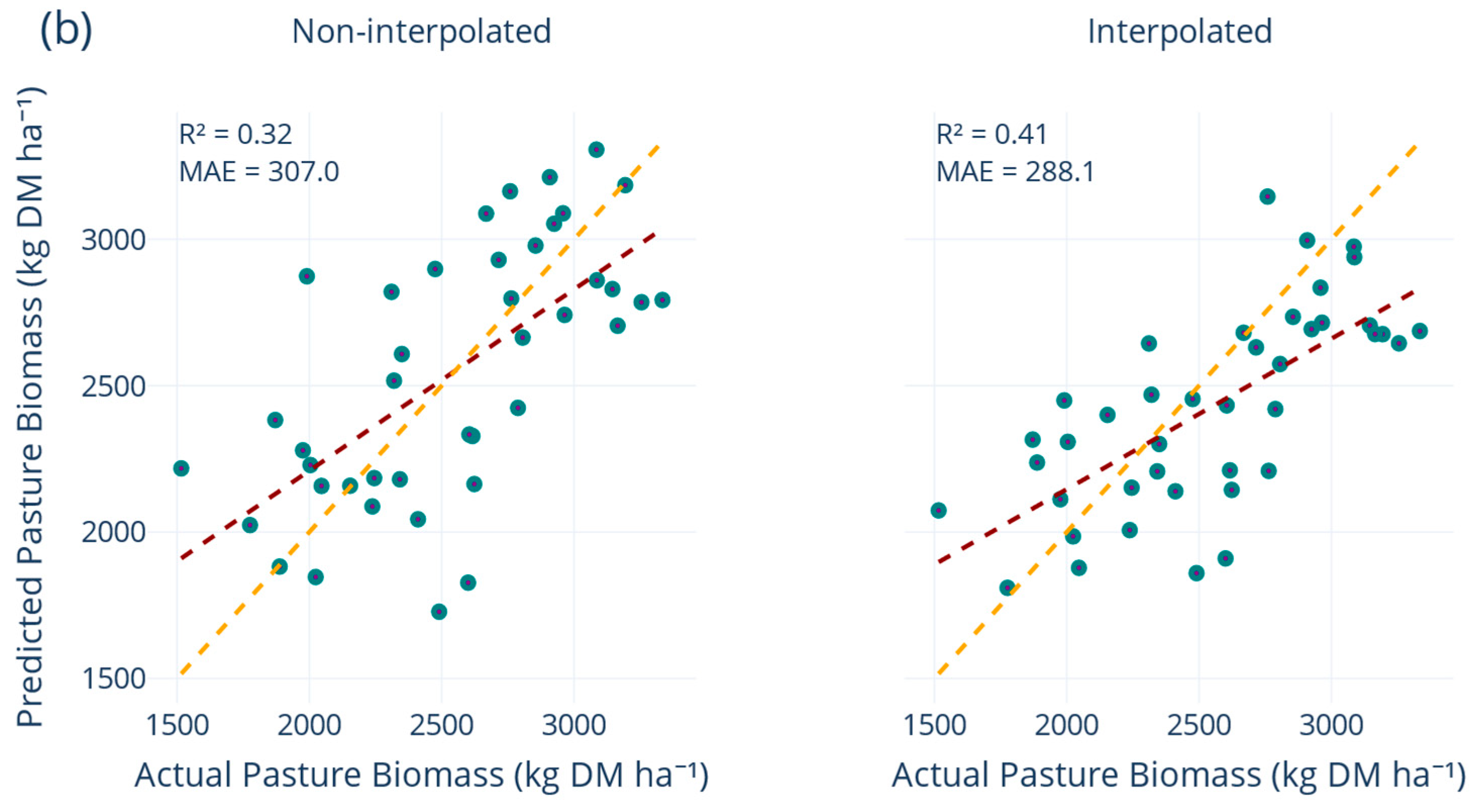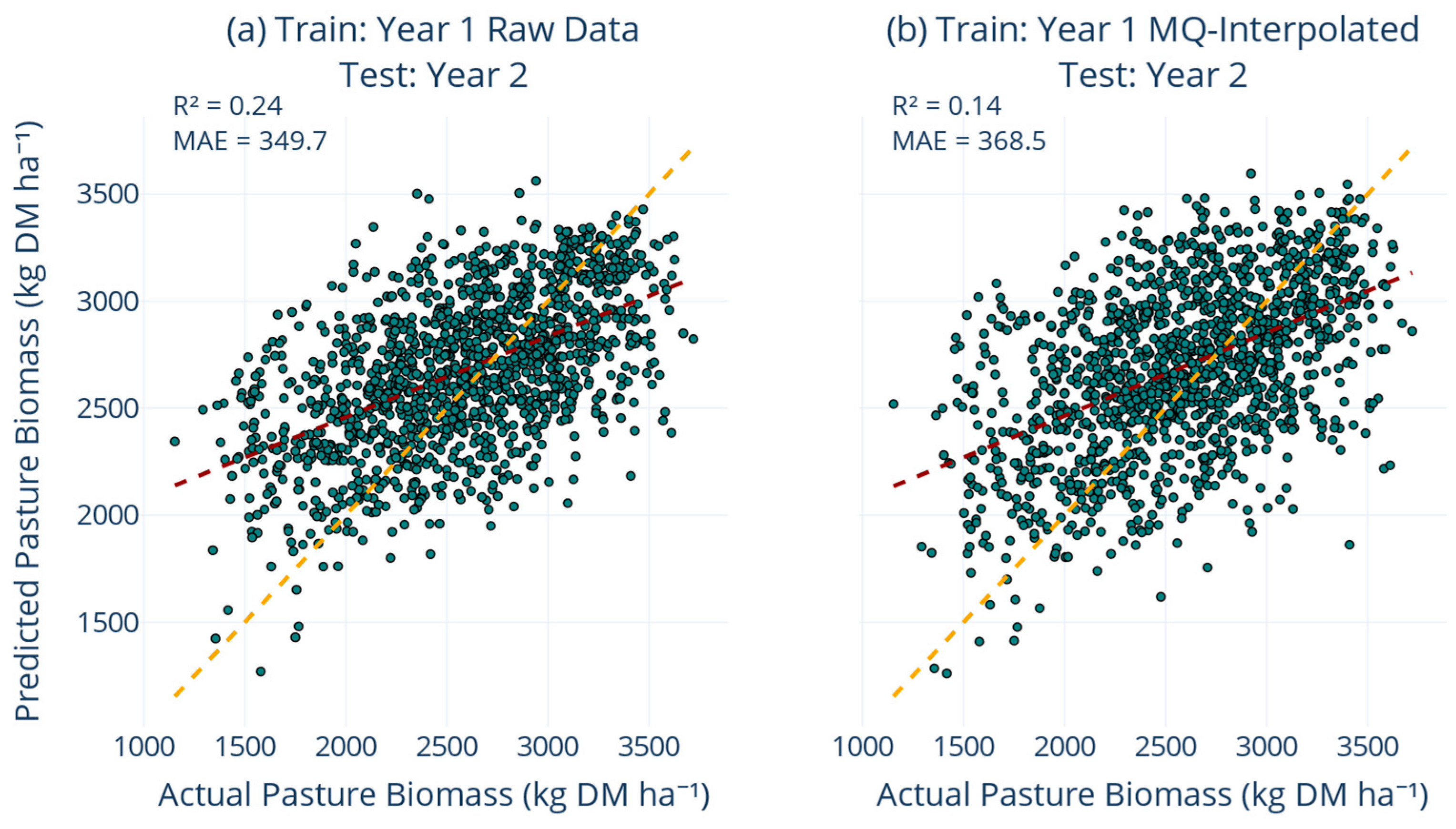 2 slipped from 0.24 to 0.14, MAE rose from 349 to 368 kg DM ha