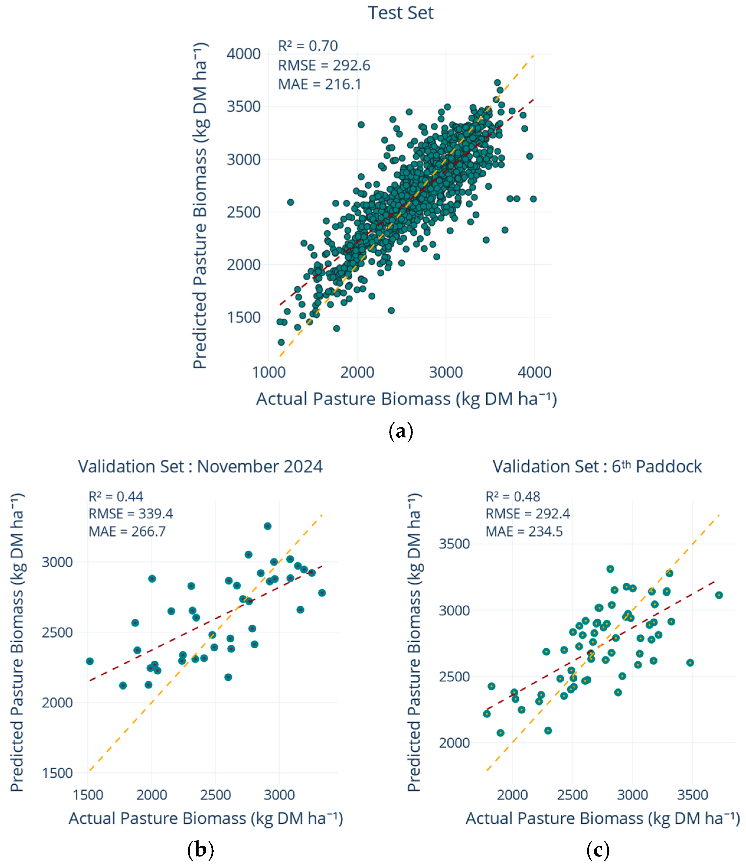 For the validation, two independent hold-out samples were excluded from all training steps, including non-interpolated, interpolated, and progressive training workflows, and were kept free of any interpolation or gap-filling procedures to represent truly unseen data. The first independent validation sample comprised 41 records representing all available and valid paired RPM PB and Sentinel-2 imagery observations collected from the five primary monitored paddocks across nine of the study farms between 1 and 30 November 2024. The specific count of 41 records was the outcome of applying the data-quality filters (i.e., PB values between 1000 and 4000 kg DM ha−1) to all available measurements during this validation period. For these records, PB measured with RPM was merged with same-day Sentinel-2 imagery, and cloud-affected scenes were handled by replacing them with the corresponding weekly mean reflectance. The selection of these nine farms was based on the availability of complete, high-quality independent data that met the validation criteria during this specific November 2024 period, ensuring they provided fresh, untainted observations.