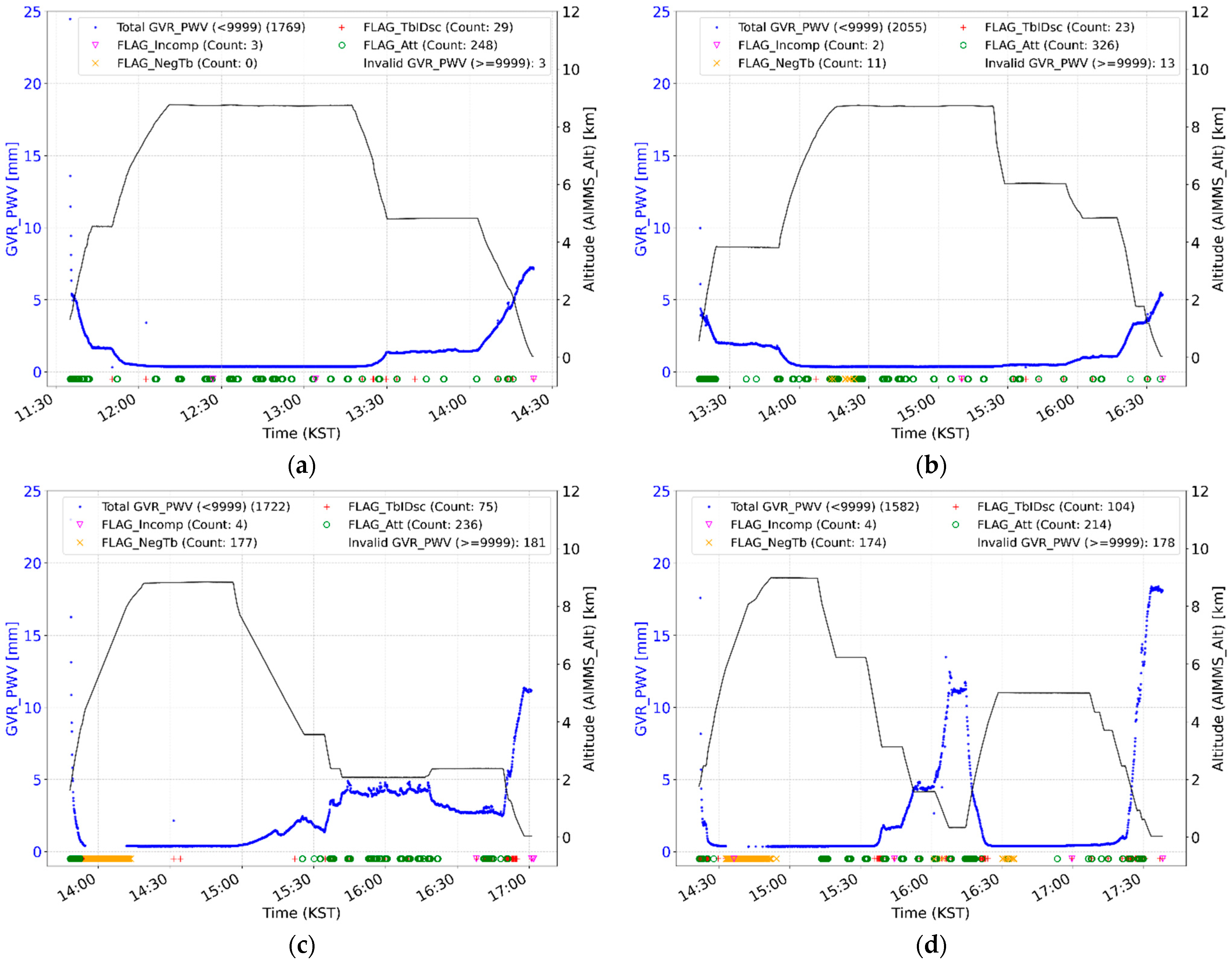 - GVR Quality Control: The 14 March flight, which was a highly dynamic mission of approximately 3.5 h (14:30–18:00 KST), was the most complex case among those analyzed. This flight was characterized by a multilayered profile with repeated ascents and descents. This complexity was directly reflected through the QC flags. A dense cluster of 174 FLAG_NegTb points was observed during the initial rapid ascent and other maneuvering phases, indicating significant and recurring instrument instability. Furthermore, owing to the mission’s complexity, aircraft maneuvering (FLAG_Att, 214 points) and external radio frequency interference (FLAG_TbIDsc, 104 points) occurred consistently throughout the flight. FLAG_Incomp was intermittently triggered during abrupt transitions, showing that some calibration sequences were left incomplete when the aircraft executed sharp altitude changes. The large number of flagged data points demonstrates the QC system’s success in tracking and documenting factors affecting data quality, even under extremely dynamic conditions. The QC data are shown in Figure 3d.