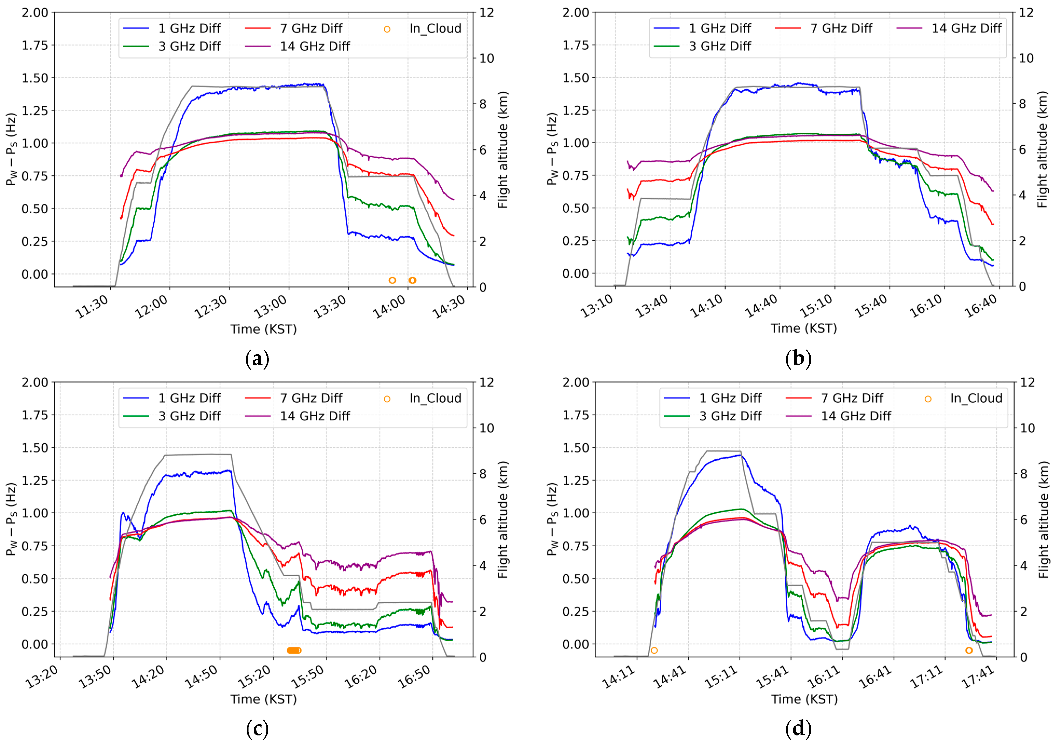 - GVR Signal Characteristics: The flight on 18 February 2018 presents ideal data for characterizing the GVR instrument’s unique performance, featuring a distinct stepped ascent and a long-duration, high-altitude flight (Figure 4a). The analysis focused on the “pure atmospheric signal” (PW − PS), which was inversely proportional to the amount of water vapor; a larger difference value signifies drier conditions. The flight began with a stepped ascent at approximately 11:35 KST. The aircraft elevated rapidly to 4 km, held a level altitude for approximately 10 min, and then resumed its climb to 9.2 km by 12:10 KST. Meanwhile, the four channel difference signals precisely tracked each stage, increasing in value as the aircraft ascended through progressively drier air. The most significant portion of this flight was the one-hour high-altitude cruise from 12:10 to 13:17 KST. During this period, the difference signal remained at its maximum, reflecting dry atmospheric conditions. Furthermore, each channel was clearly separated based on its unique sensitivity. However, this separation did not follow a simple monotonic order. Instead, the observed order of the difference magnitude was approximately 1 > 14 ≈ 3 > 7 GHz, with the 1 GHz channel showing the largest difference at ~1.45 Hz. This nonlinear ordering is caused by the complex vertical temperature profile of the atmosphere (troposphere, tropopause, and stratosphere) and the unique weighting function of each channel. This was consistent with findings from ground-based microwave radiometer studies, which have shown that the mean vertical profile of water vapor content is well described by a function of temperature, similar to that of the Clausius-Clapeyron equation [24].