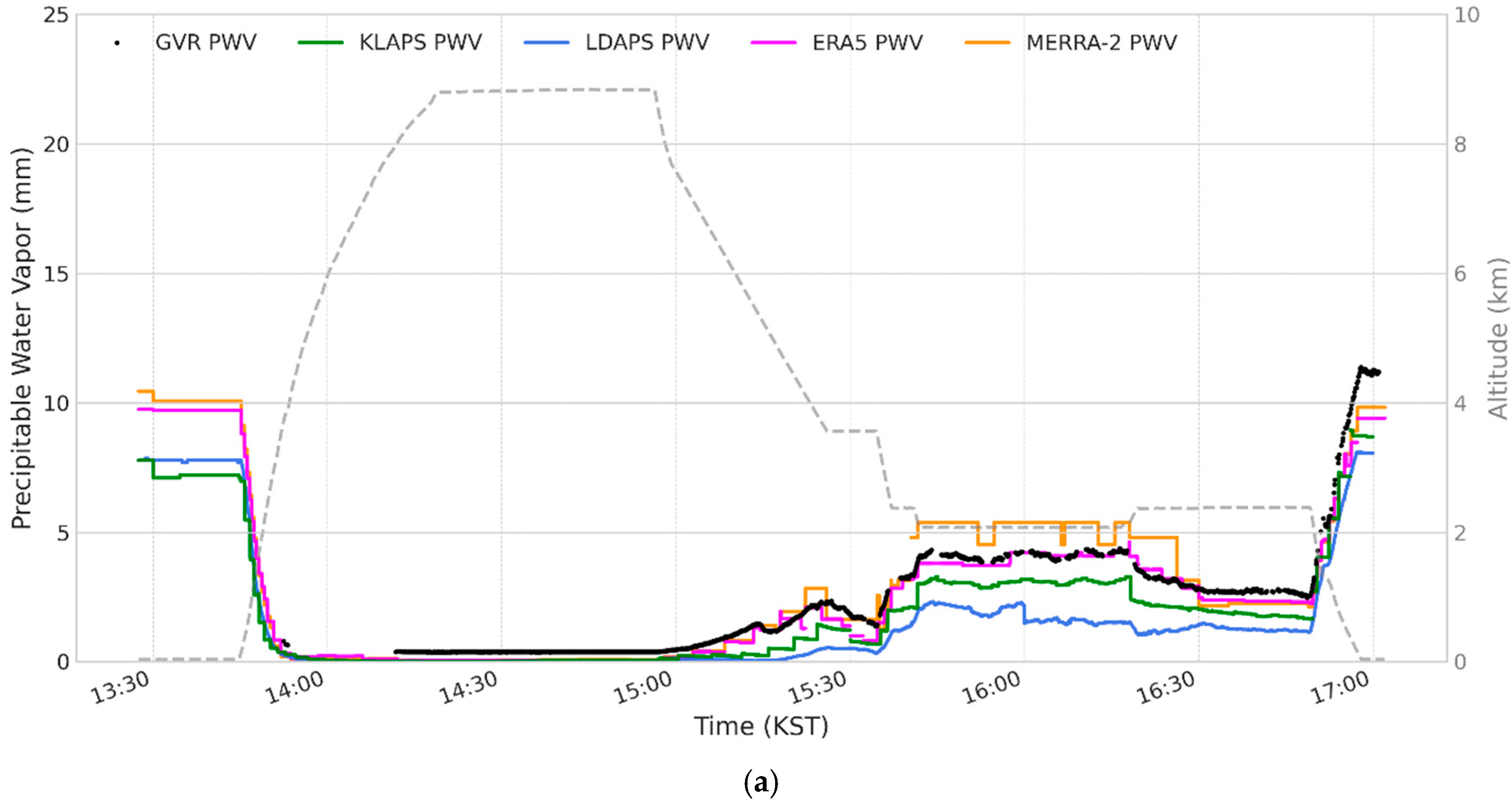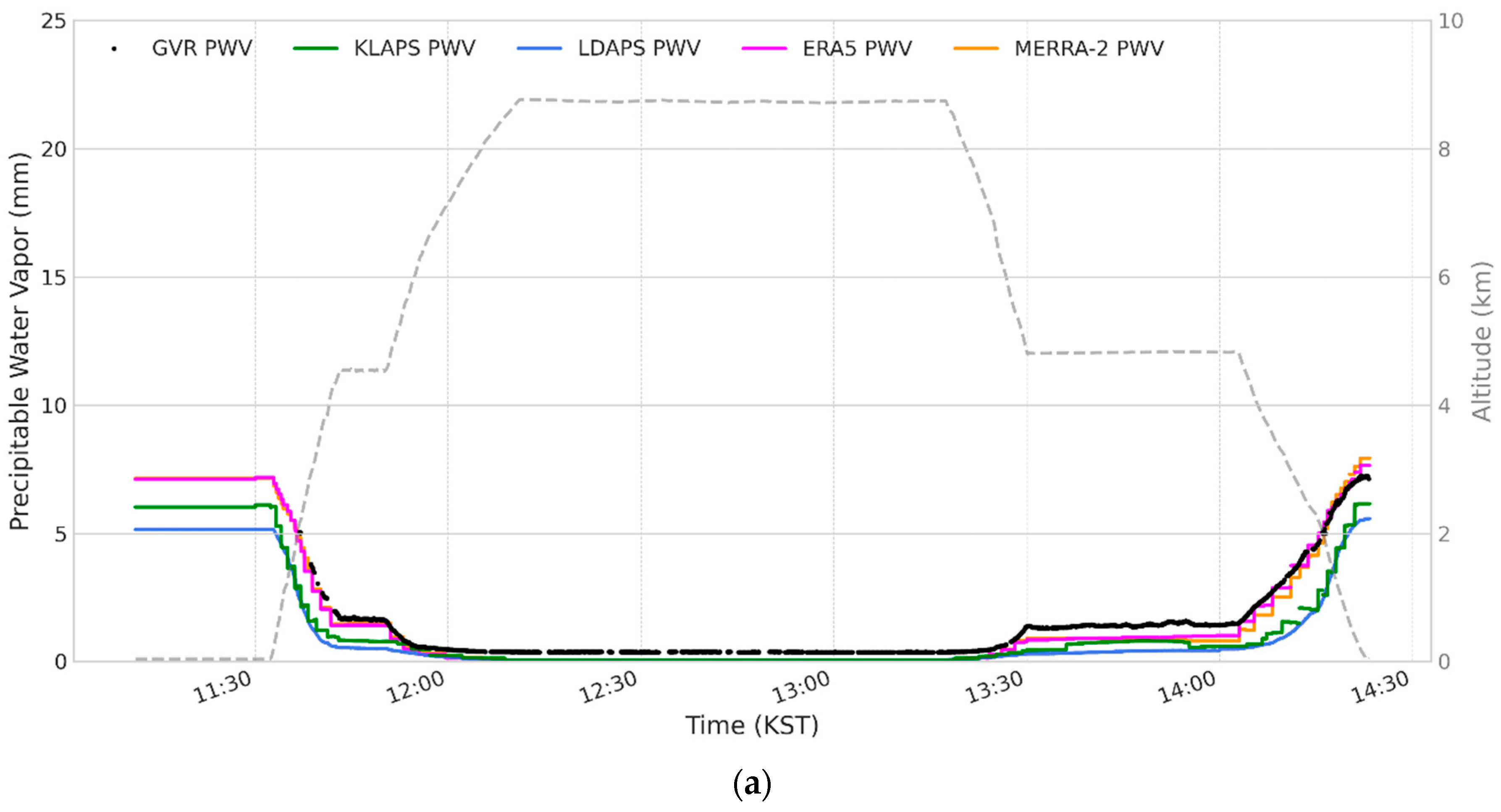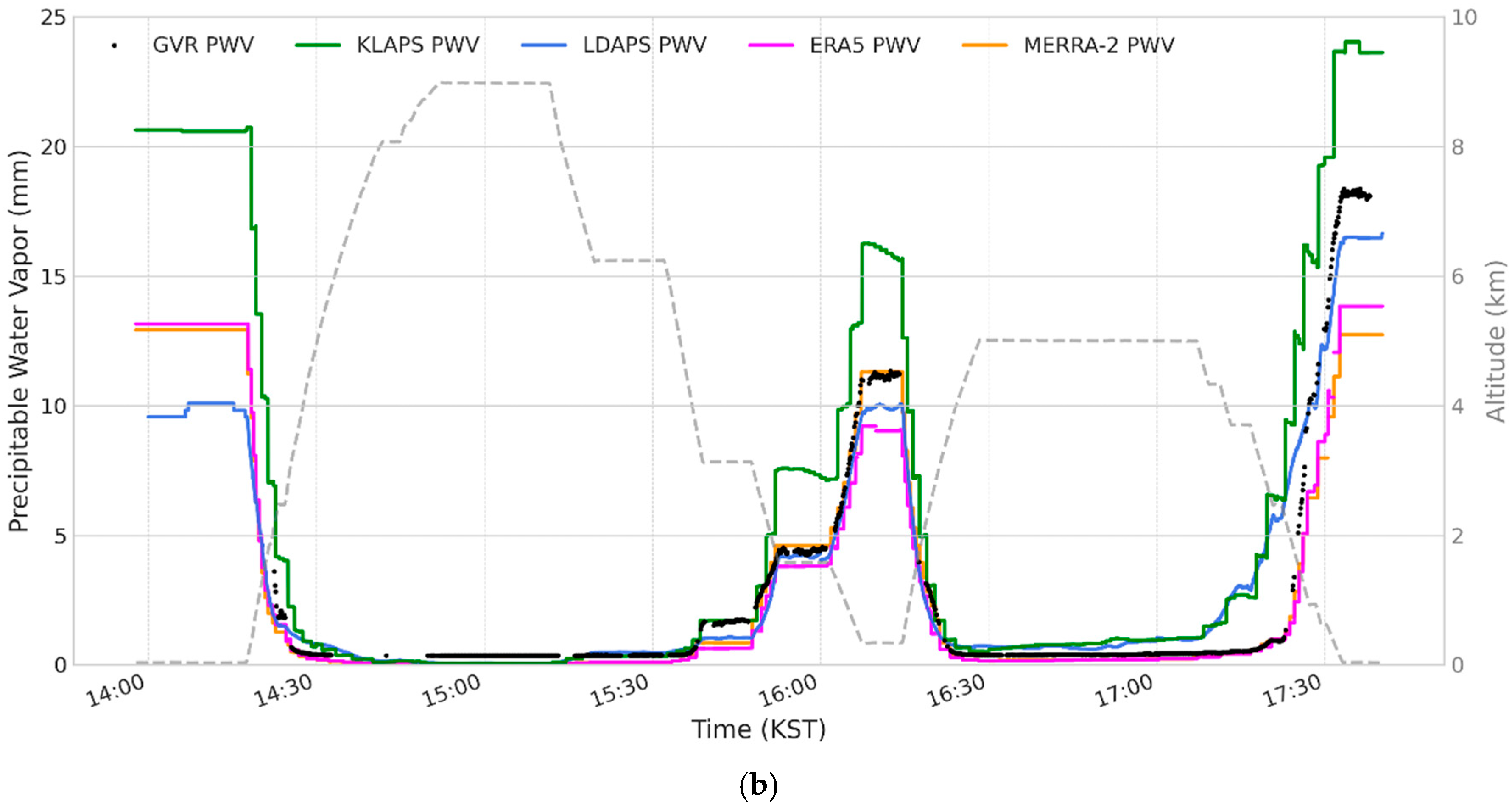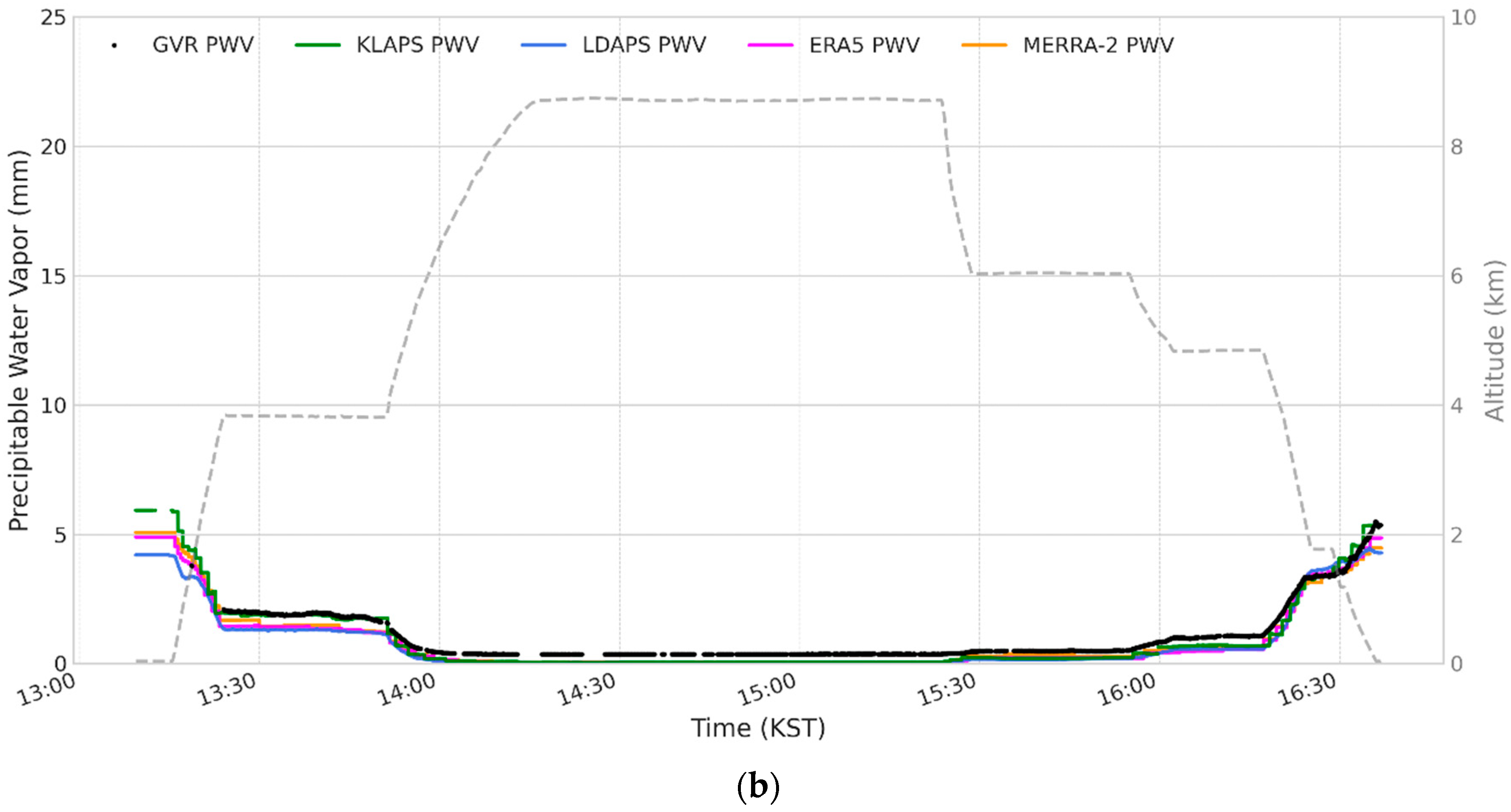 - Case 2: 24 February 2018: This case was characterized by a coastal frontal system with distinct vertical moisture structures. During the stepwise ascent (13:30–14:30), the observed PWV gradually decreased (Figure 6b). ERA5 and MERRA-2 successfully reproduced this evolution, whereas LDAPS and KLAPS followed the overall trend but consistently underestimated PWV at each step. During the cruise phase at an altitude of 9 km altitude (14:30–15:30), ERA5 and MERRA-2 remained stable, showing good agreement with the GVR, whereas the local models continued to accumulate a dry bias. In terms of statistics, MERRA-2 (r = 0.99, RMSD = 0.4 mm, MB = −0.33 mm) showcased the smallest error, followed by ERA5 (r = 0.99, RMSD = 0.38 mm, MB = −0.35 mm). LDAPS and KLAPS, however, exhibited negative biases of −0.38 mm and −0.24 mm, respectively.