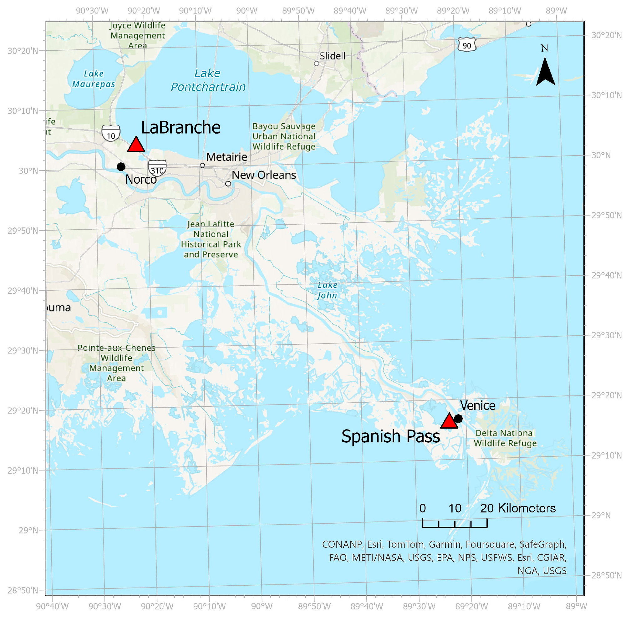 Two coastal study sites in southeast Lousiana were selected from an inventory of potential candidate sites, including Spanish Pass Ridge and Marsh Restoration (BA-0191) and Bayou LaBranche Wetlands Creation (PO-17), referred to hereafter as Spanish Pass and LaBranche, respectively (