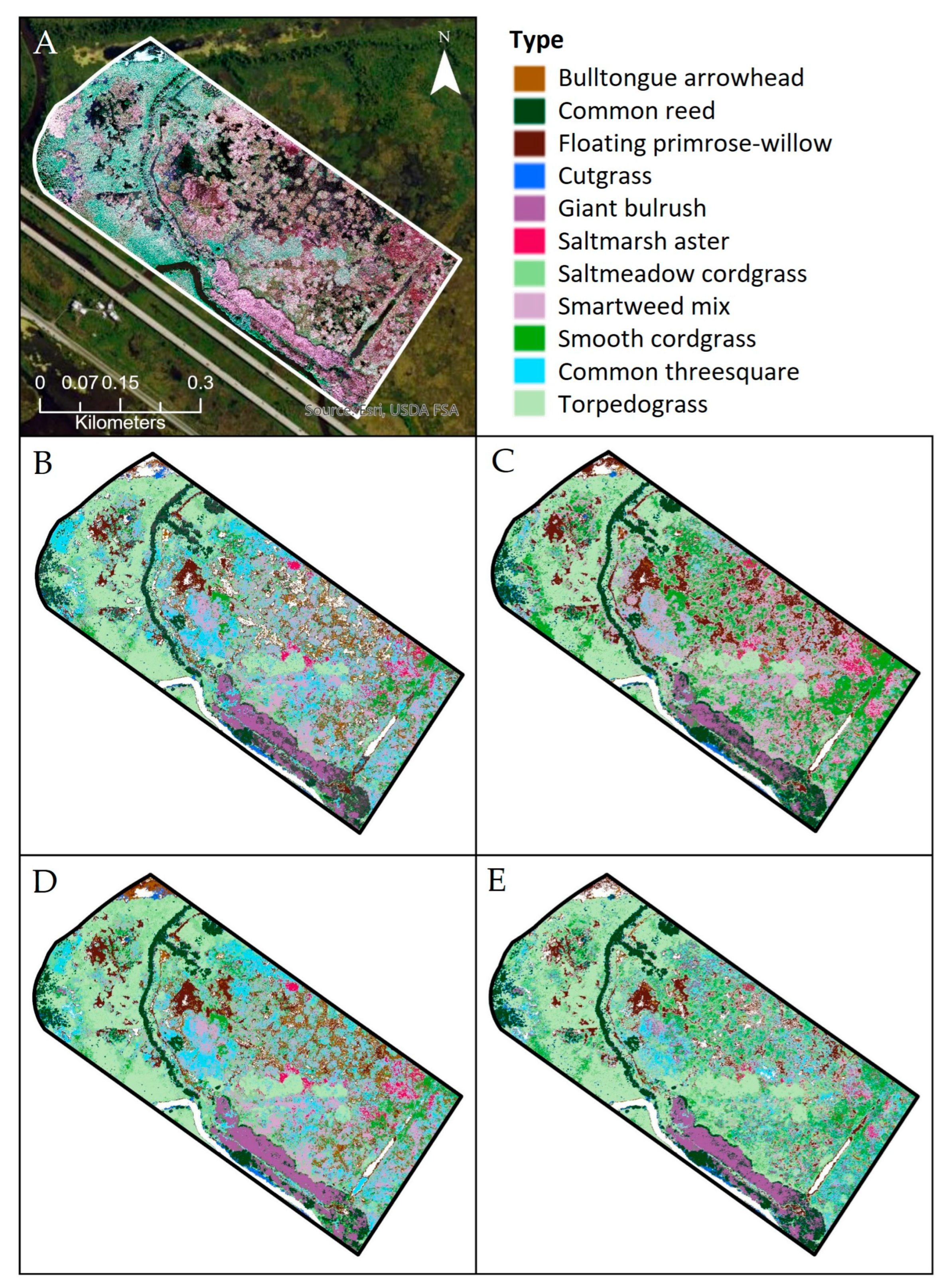 Typha), and a mixed other class) as opposed to more detailed classes that could not be distinguished in the UAS imagery.