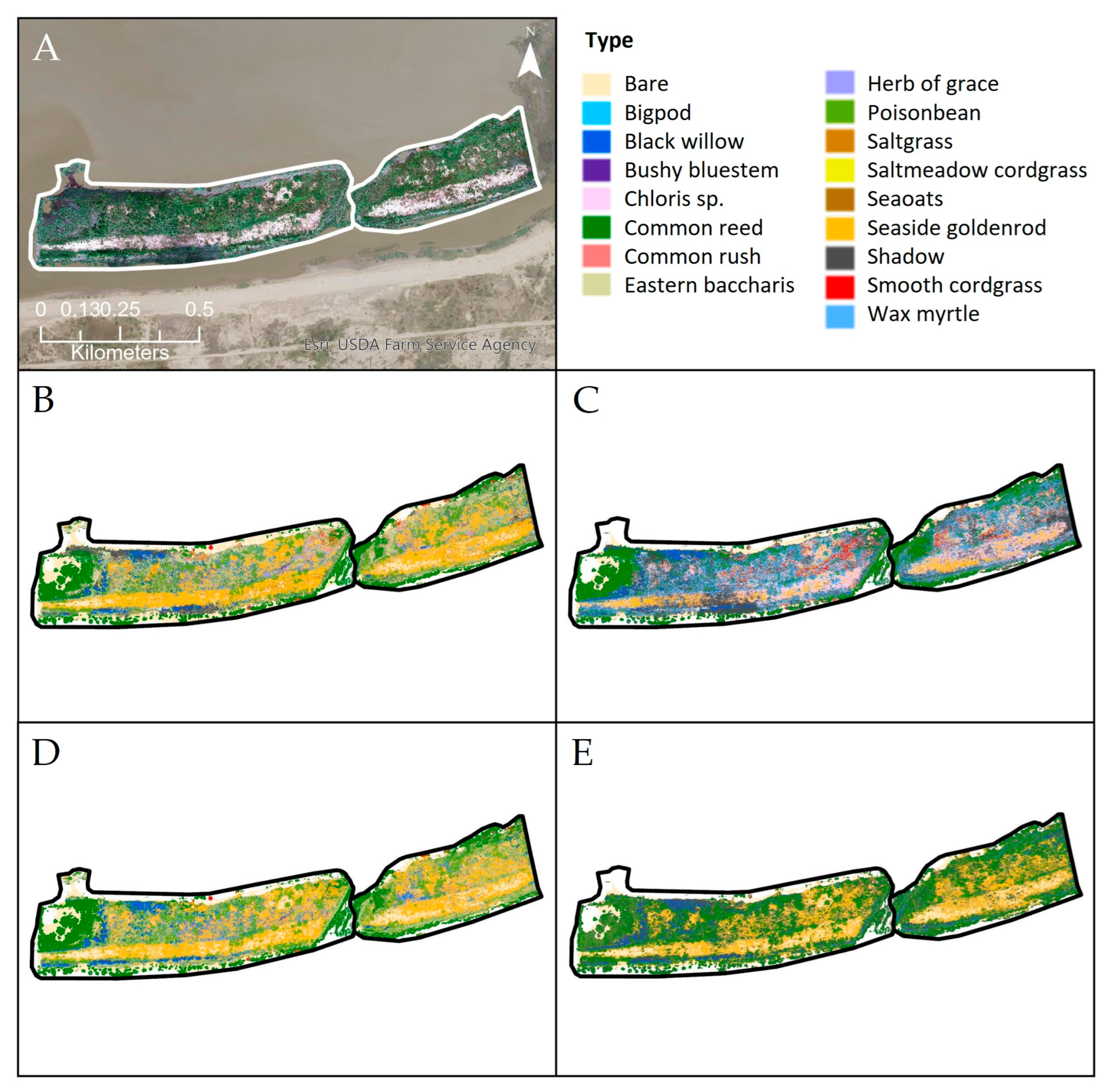 Figure 3A,B), due to site restrictions, yet the reduced plots were selected to capture ecological variability. Plot data were reserved for comparison to the remote sensing classification results.