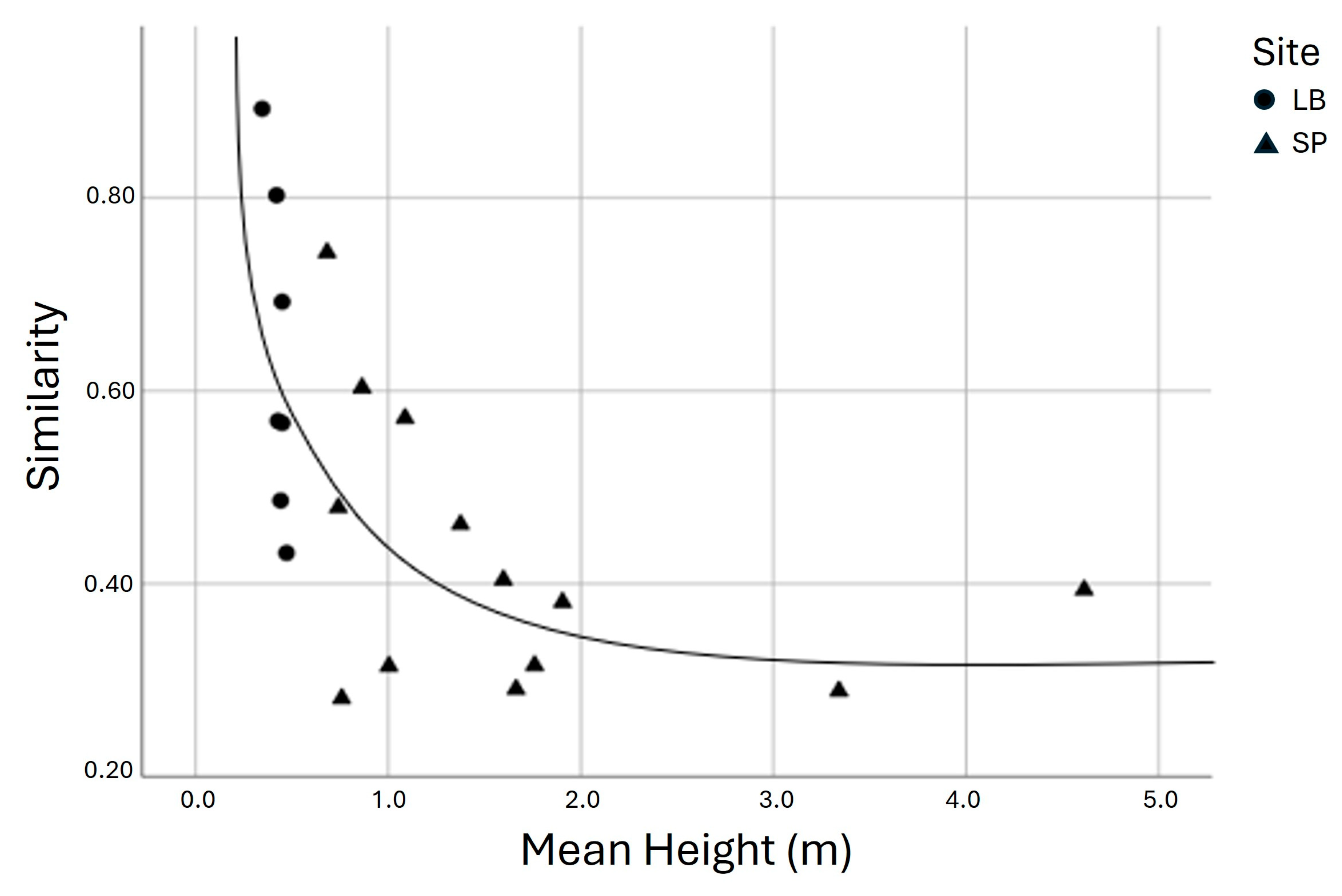 The performance differences between LaBranche and Spanish Pass highlighted the influence of local environmental conditions and vegetation assemblage complexity on model results compared to traditional field plot data even within individual restoration sites. The significant correlations between model similarity scores and field-based vegetation variables (mean and maximum height, canopy-forming coverage, and taxa richness) at both sites (r