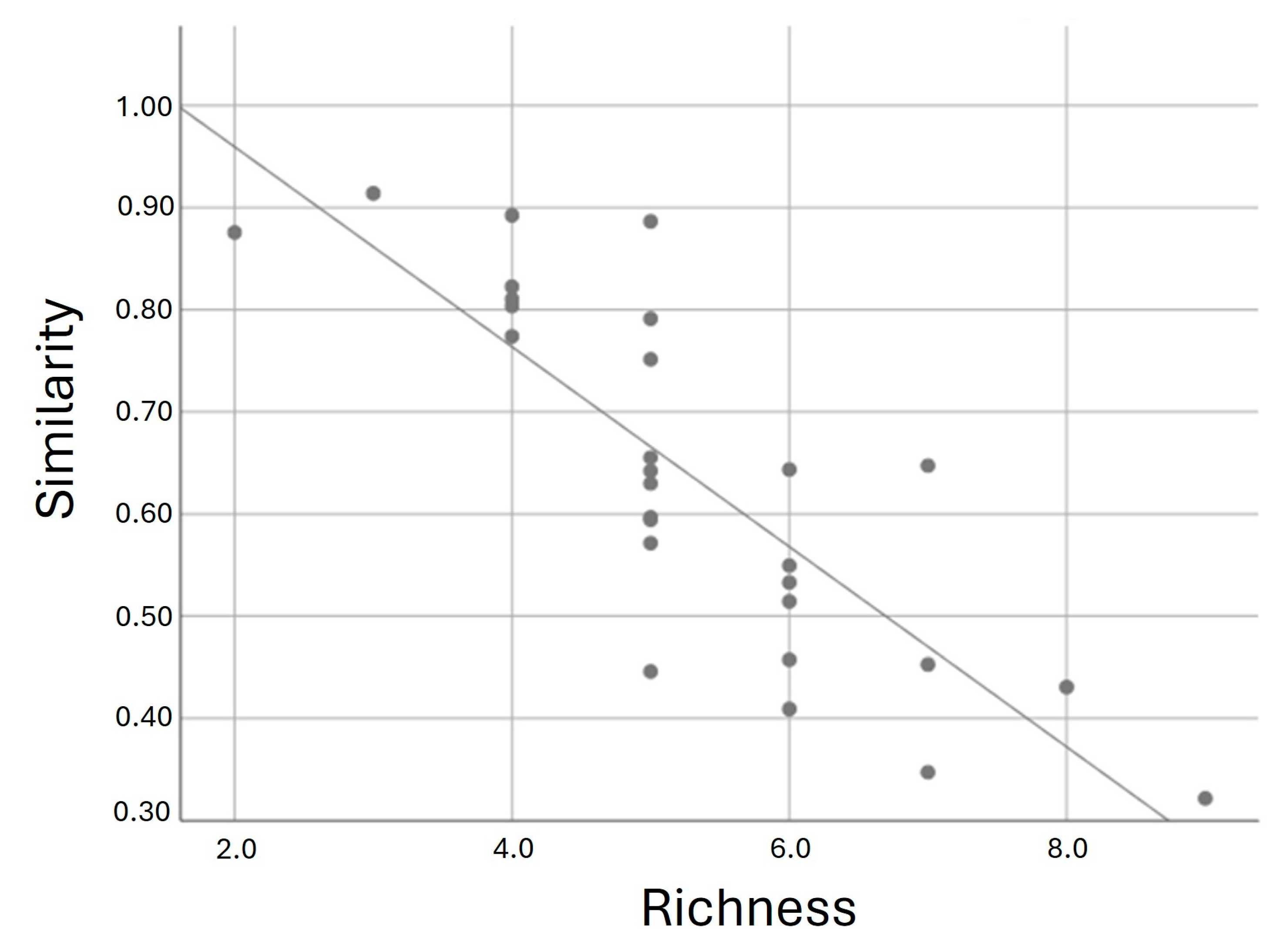 Spartina patens) created spatially coherent patches with clear spectral characteristics for select plots at LaBranche. At this site, plots with relatively higher taxa richness (e.g., PO17-02 and LB9) experienced comparatively lower similarity scores than more homogeneous plots (e.g., LB1 and LB2) which had higher similarity scores. Not surprisingly, the more mixed plots had reduced model similarity scores (e.g., decreased classification performance across model combinations) compared to field monitoring data. This trend is consistent with reduced classification accuracies for class types prone to increased intermixing of species or species with more heterogenous features, in which increased spectral variability can lead to classification confusion [