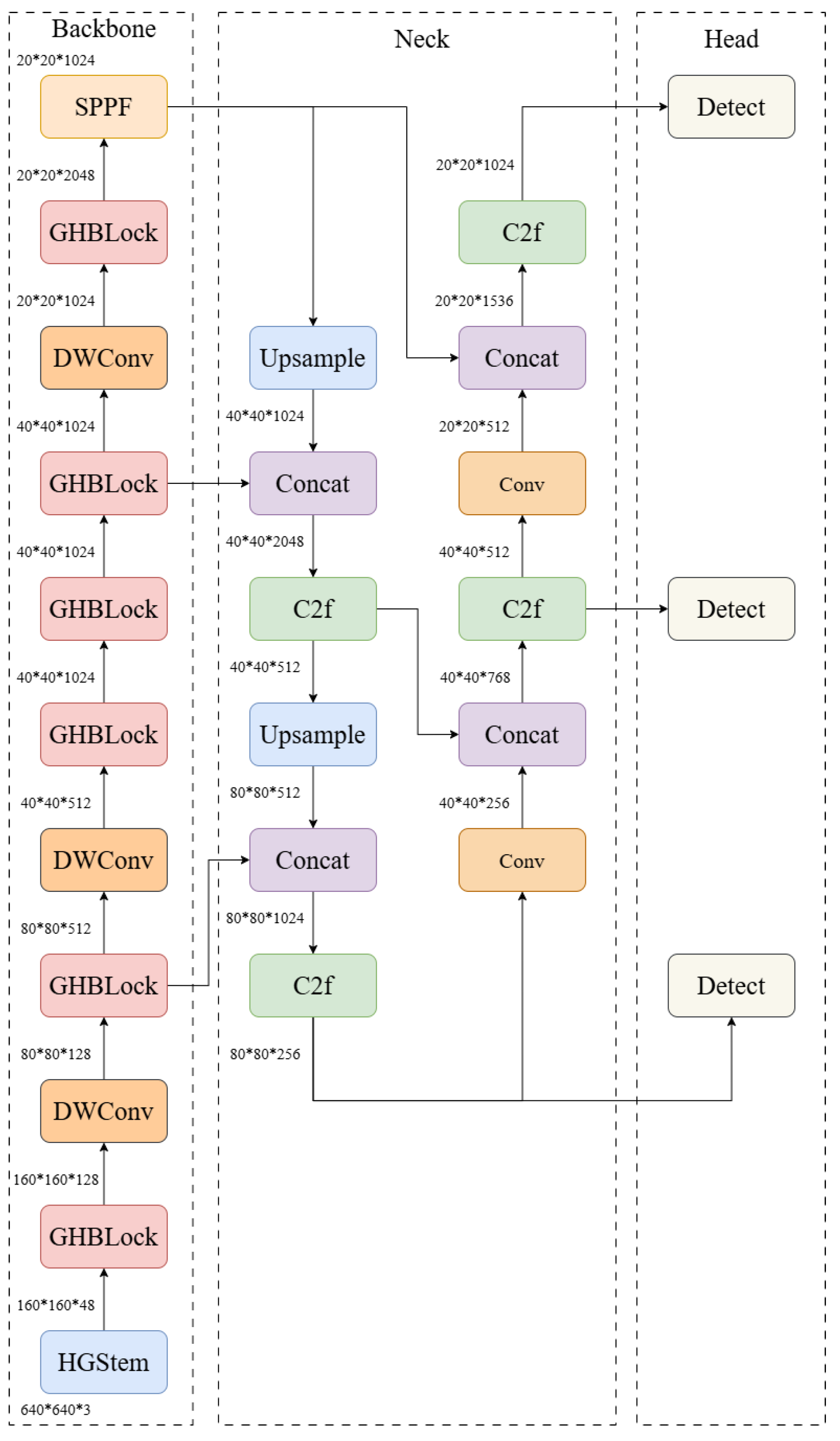 Backbone Design. The backbone architecture replaces YOLOv8n’s Conv-C2f structure with a lightweight pipeline comprising HGStem, alternating GHBlock/DWConv stages, and SPPF. The network begins with HGStem (640 × 640 × 3 → 160 × 160 × 48), which performs efficient shallow feature extraction via depthwise separable convolutions. GHBlock and DWConv modules then alternate to extract hierarchical features with progressive spatial downsampling. Early stages (160 × 160 → 80 × 80) capture mid-level features, intermediate layers (80 × 80 → 40 × 40) balance spatial details with semantic abstraction, and deeper stages (40 × 40 → 20 × 20) extract high-level contextual information essential for robust SAR ship detection. SPPF pooling concludes the backbone by expanding receptive fields and aggregating multi-scale context. This design achieves substantial compression compared to YOLOv8n’s baseline: parameters decrease from 3.0 M to 2.3 M (a 23.3% reduction) and FLOPs decrease from 8.1 G to 6.8 G (a 16.0% reduction) while preserving feature representation quality.