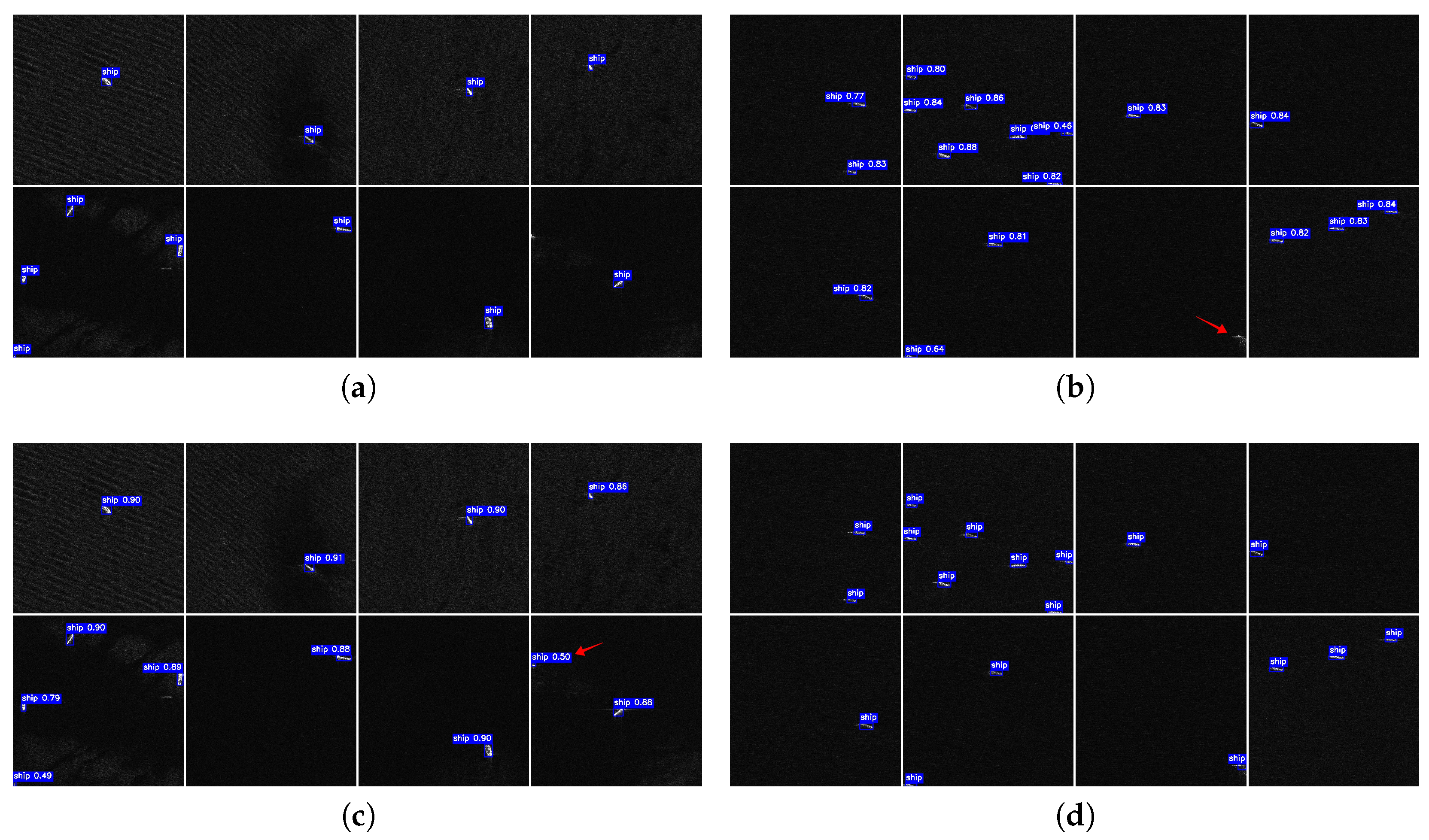 Figure 9. Detection result citatts on the RSDD-SAR dataset. The results demonstrate LGNet’s capability to accurately detect ships of various sizes and orientations in complex SAR scenes. (a) Ground truth labels—batch 0. (b) LGNet predictions—batch 0. (c) Ground truth labels—batch 1. (d) LGNet predictions—batch 1. Red arrows in (b) and (c) indicate regions with detection errors.