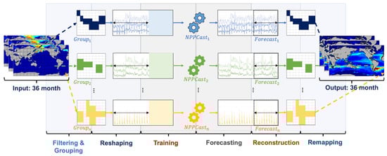 Schematic workflow of NPPCast. The 36-month global NPP input cube (left) is first filtered with an ocean–land mask, producing a sparse matrix that is then grouped into n geographically contiguous, dynamically coherent sub-domains (Group1, Group2, …, Groupn). Each group is reshaped into a multivariate time series and fed to its own lightweight forecaster (NPPCast1…NPPCastn) during the training stage. At inference time, the individual models produce 36-month forecasts that are reconstructed back onto their local grids and finally remapped into a seamless global field (right).