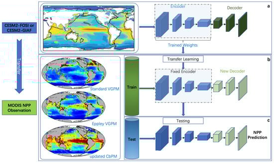 With the advancement of satellite ocean-color remote sensing, various algorithmic models have been developed to estimate NPP. Among them, the Vertical Generalized Production Model (VGPM) is one of the most widely applied, estimating depth-integrated NPP from surface chlorophyll, sea surface temperature, photosynthetically available radiation (PAR), and the euphotic depth []. Given uncertainties associated with satellite-derived chlorophyll concentrations, Behrenfeld et al. [] introduced the Carbon-based Productivity Model (CbPM), which replaces chlorophyll with phytoplankton carbon—derived from the particle backscattering coefficient to estimate NPP. This approach was later refined by Westberry et al. [], who introduced a spectrally resolved light attenuation scheme, to better represent the underwater light field. Additionally, Lee et al. [] developed the Absorption-based Productivity Model (AbPM), which estimates NPP from the absorption of solar radiation by phytoplankton, using satellite-derived absorption coefficients and PAR. Despite these advances, such models remain limited by their reliance on satellite observations, highlighting the need for predictive approaches capable of forecasting NPP under varying environmental and climate conditions.