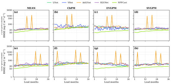 Lead-time evolution of for UNet, VNet, AttUNet, R2UNet, and NPPCast. Rows show CESM2–FOSI (top, (a–d)) and CESM2–GIAF (bottom, (e–h)) pre-training; columns correspond to the four MODIS NPP products. Overall, NPPCast exhibits the slowest error growth and the lowest across most leads—clearly so for MEAN, EVGPM, and SVGPM. For CbPM, the separation is weaker and NPPCast’s curve intersects the best UNet-family baseline at a few leads under both pre-training scenes. Note: RMSE values are shown on a scale with tick labels converted to actual values for clarity.