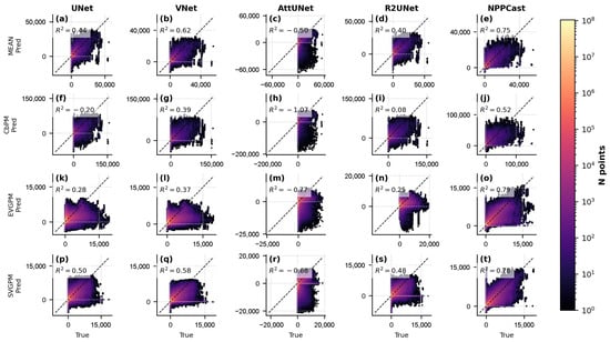 FOSI pretraining (negatives removed). Same as Figure 9 but censoring predictions (rows: MEAN (a–e), CbPM (f–j), EVGPM (k–o), SVGPM (p–t)). for UNet-family models increases substantially; NPPCast changes only slightly, confirming that extreme negative values mainly originate from negative predictions in the baselines.