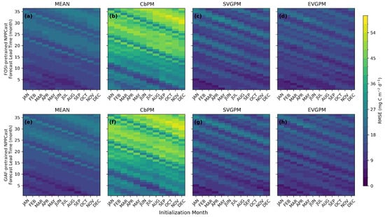 We further analyzed the spatial distribution of RMSE at different prediction lead times. The results show that, at a 12-month lead time (Figure 7), all models exhibit similar spatial error patterns, with larger errors generally occurring in high-latitude regions (the North Atlantic, the North Pacific, and the Southern Ocean), coastal areas, and the extension regions of the western boundary current, while smaller errors are found in the subtropical oligotrophic gyres. Compared with the CbPM products, the other products exhibit relatively larger errors in high-latitude and coastal ocean regions. In contrast, NPPCast consistently achieves lower RMSE than the UNet family across most ocean basins, with particularly pronounced improvements in the Southern Ocean and the high-latitude regions of the Northern Hemisphere. The results under the FOSI and GIAF cases differ only slightly, and their overall spatial patterns remain largely consistent.