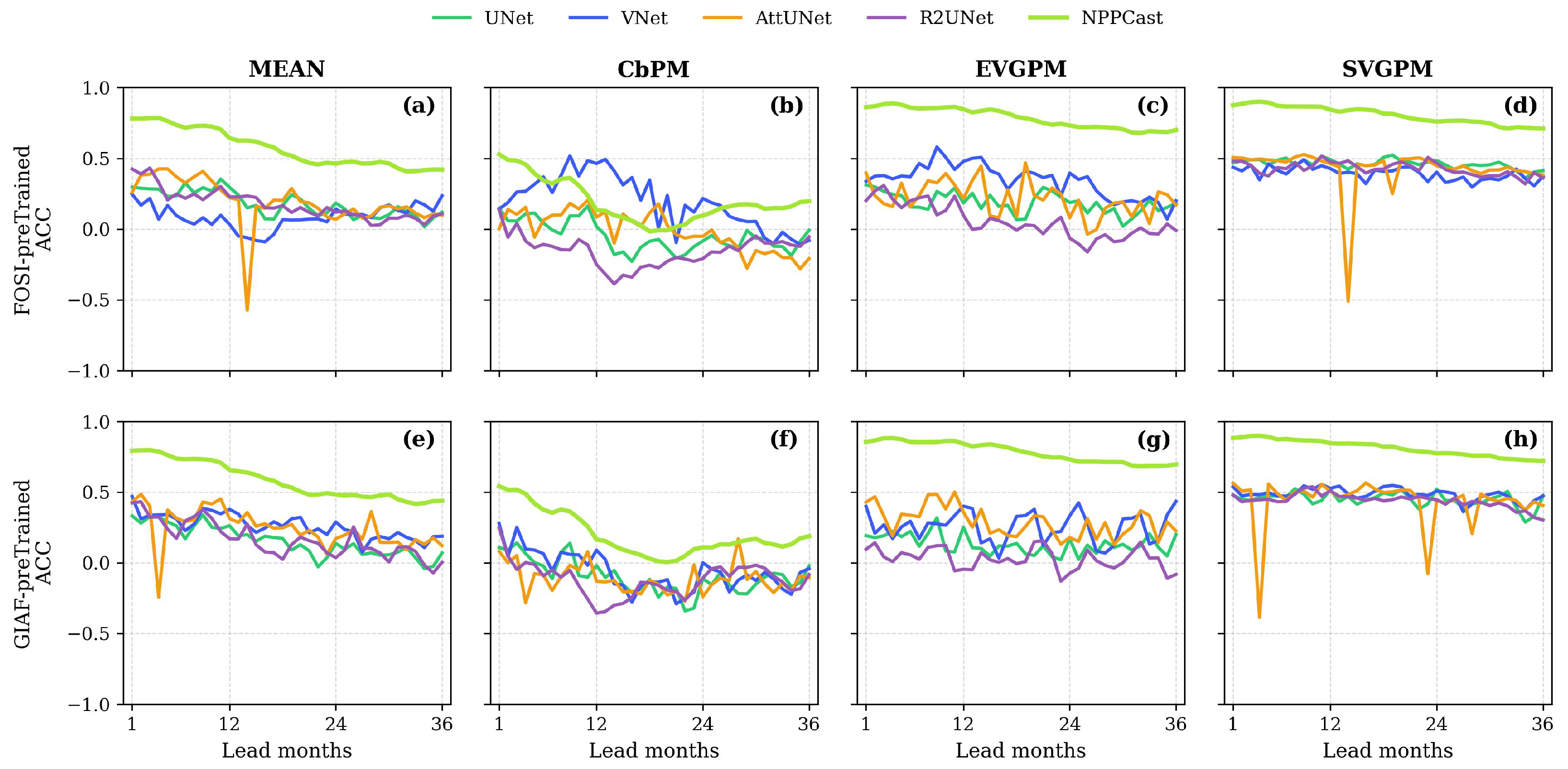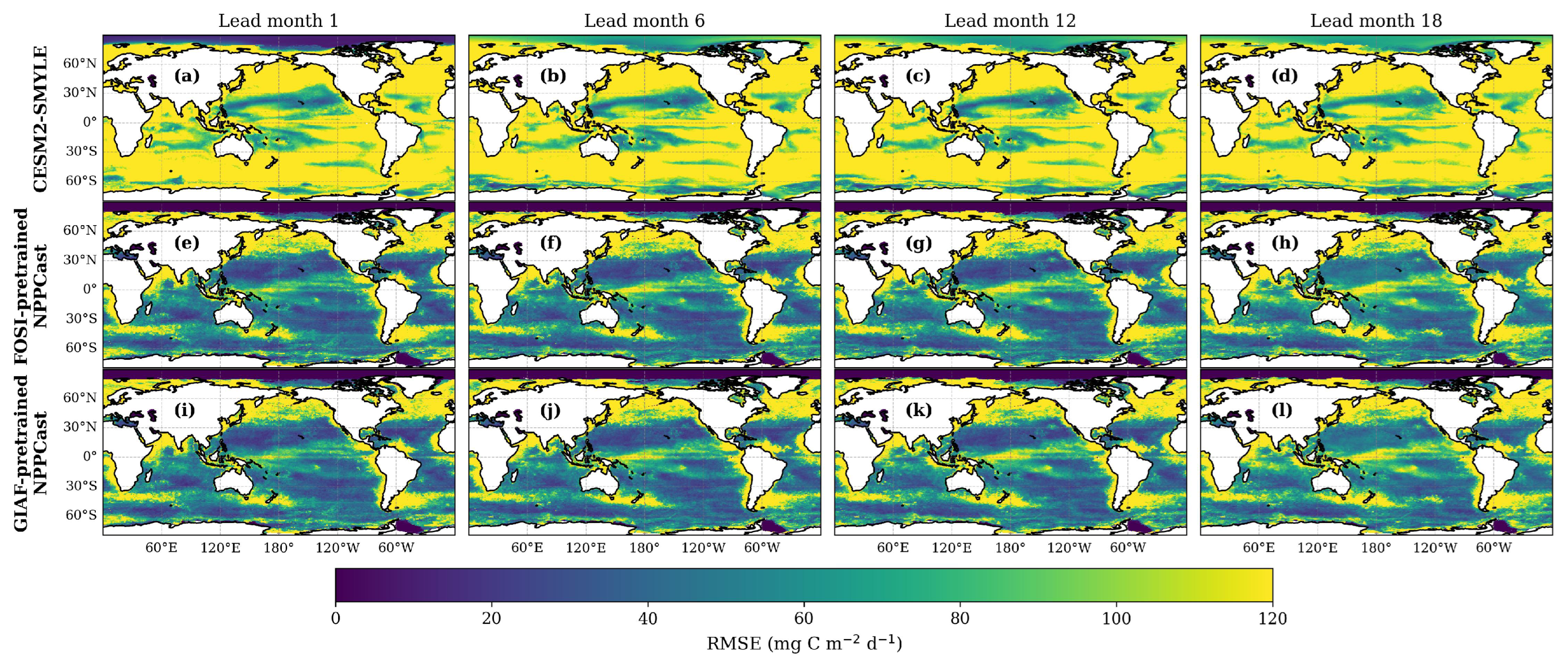 - NPPCast outperforms UNet-family models and CESM2 hindcasts across most leads and regions.