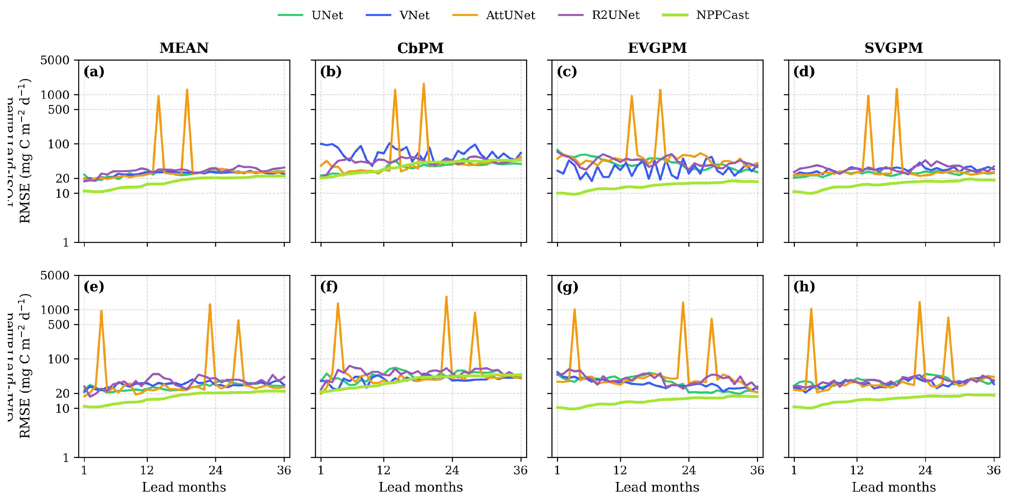 - Li, Z.; Wu, B.; Yin, Z.; Chen, R.; Wang, S. Analysis Code and Dataset for “Beyond UNets: A Compact Architecture Outperforms Encoder–Decoder CNNs in Global Ocean NPP Forecasts”; Zenodo: Geneva, Switzerland, 2025. [Google Scholar] [CrossRef]